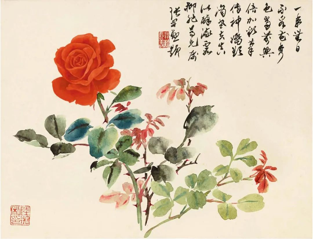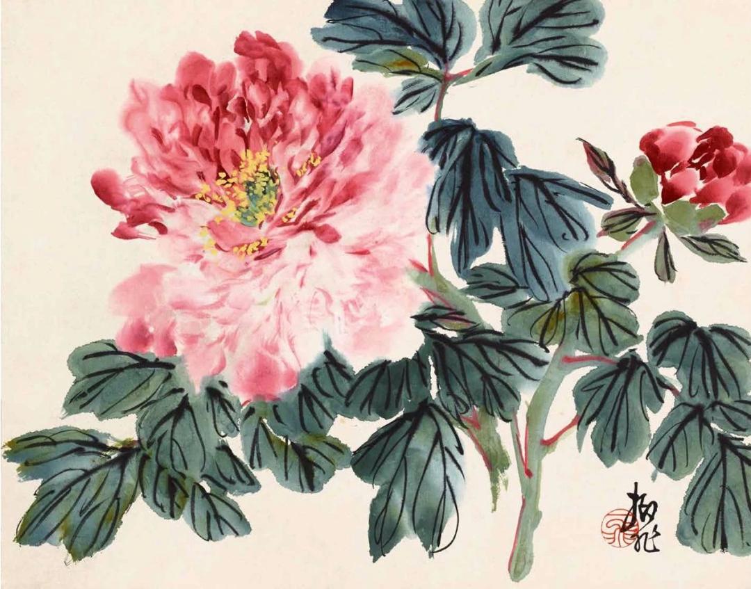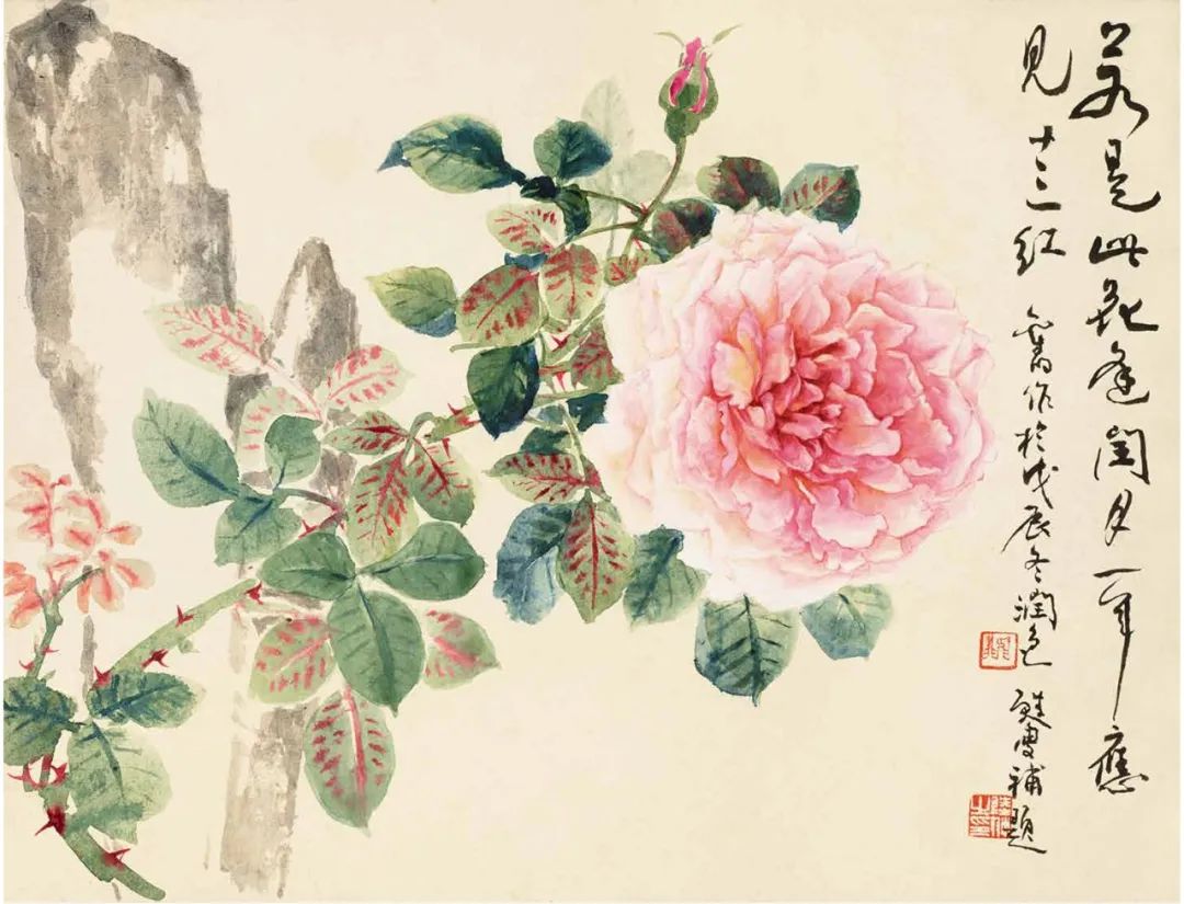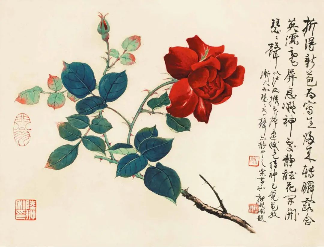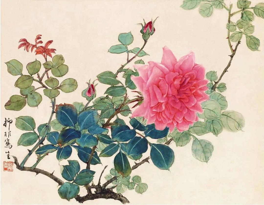 细细品读他的牡丹图,每一笔都蕴含着深厚的功力,或浓墨重彩,或轻描淡写,却总能将花瓣的柔美、花蕊的精巧、枝叶的挺拔淋漓尽致地展现出来。那娇艳欲滴的花朵,仿佛在眼前轻轻摇曳,暗香浮动,令人心醉。他笔下的月季,则更多了几分少女的娇羞,花瓣层层叠叠,色彩明丽,宛若一位亭亭玉立的佳人,含羞带怯地低垂着头。