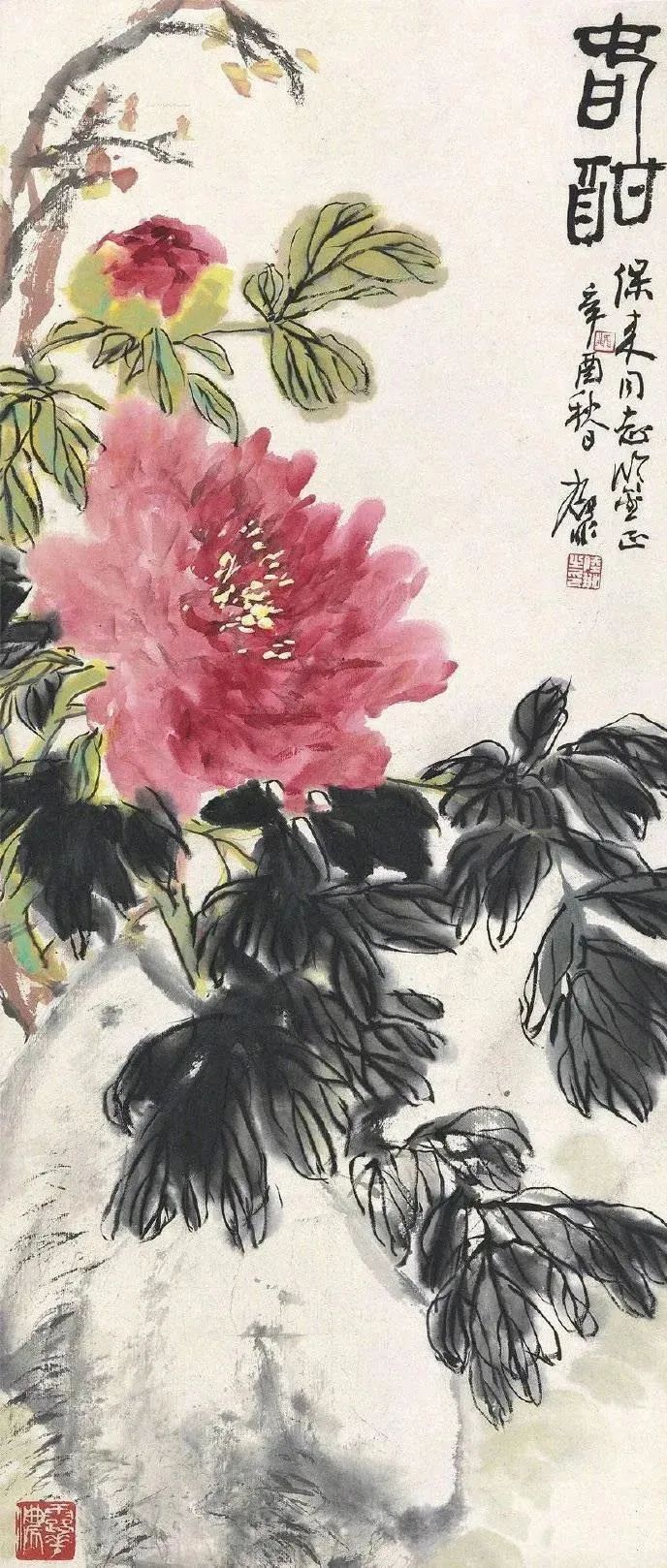 而说到陆抑非先生的作品,不得不提那令人惊艳的牡丹。他笔下的牡丹,堪称一绝,因此人们尊称他为“陆牡丹”。他的牡丹,并非仅仅是富丽堂皇的象征,更蕴含着一种超然脱俗的韵味。花瓣丰腴,姿态挺秀,妩媚动人,却丝毫不显俗气,反而透着一股浓郁的“书卷气”。这是一种脱俗的气质,是经过岁月的沉淀和灵魂的洗礼后,才能自然流露的清雅与高洁。它不落俗套,不媚俗世,而是以一种独特的姿态,展现着生命的蓬勃与优雅。