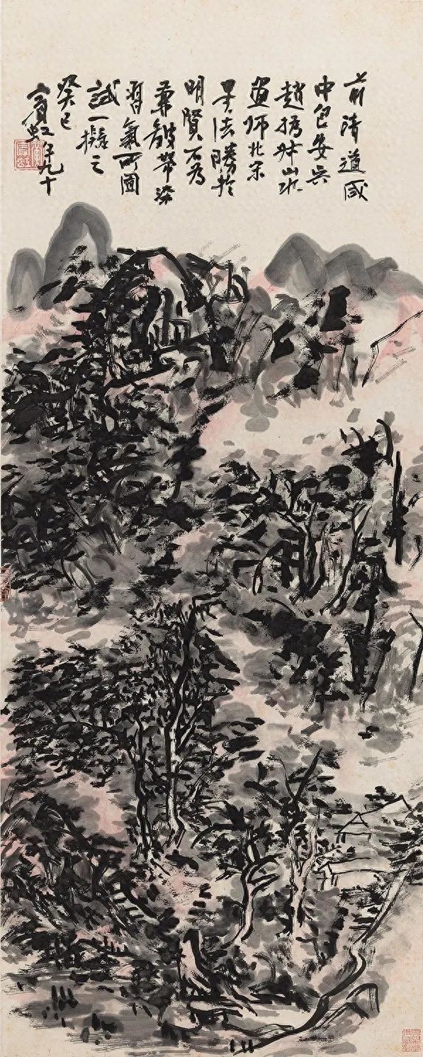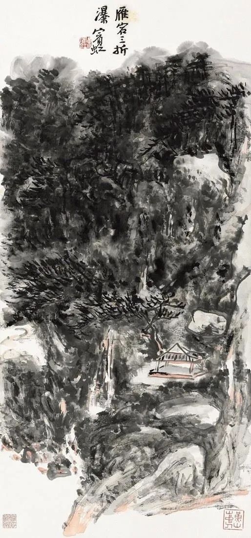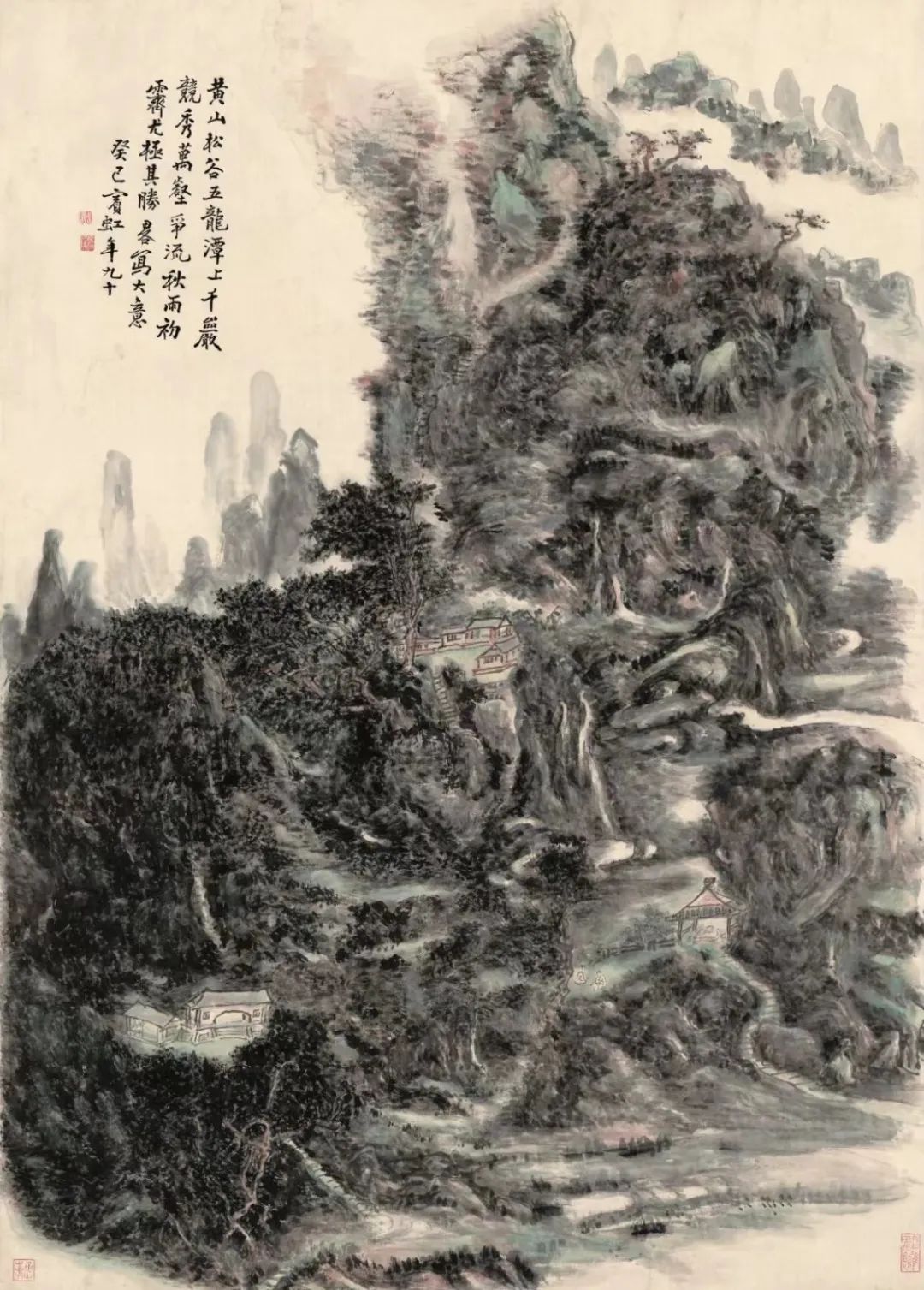 细品黄宾虹的山水画,你会发现,那墨色并非单调的黑色,而是蕴藏着无限的层次和变化。淡墨轻染,如云烟缥缈,给人以空灵之感;破墨飞溅,似雨后山岚,展现着生命的勃勃生机;积墨凝重,如同历史的厚重感,让人感受到时间的沉淀和岁月的沧桑。他那精妙的“五笔七墨”技法,更是在传统的基础上,开创了新的境界。每一点、每一笔,都饱含着深情,都像是跳跃的音符,奏响着天地间的交响乐章。