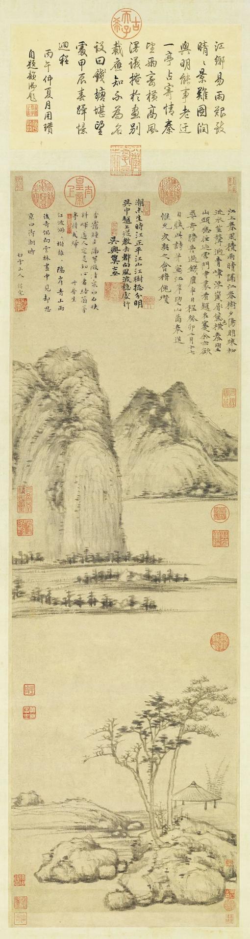 《江岸望山图》中,那绵延的远山,在氤氲的水汽中若隐若现,仿佛轻纱般笼罩着宁静的江岸。几笔简练的线条,勾勒出几株挺拔的树木,它们静静地伫立着,仿佛在诉说着岁月的静默。 整幅画作,以“一河两岸三段式”的构图,营造出一种空灵的意境,没有喧嚣的鸟语,也没有纷扰的人迹,只有山水的静默与画家的孤寂。