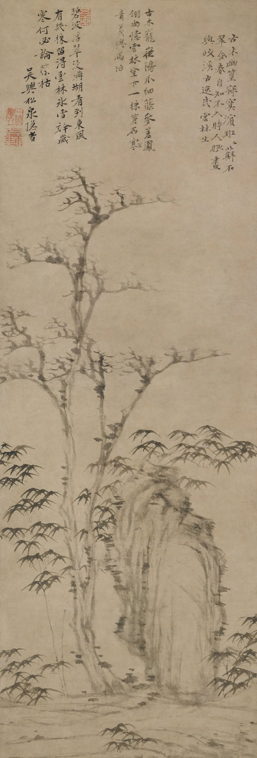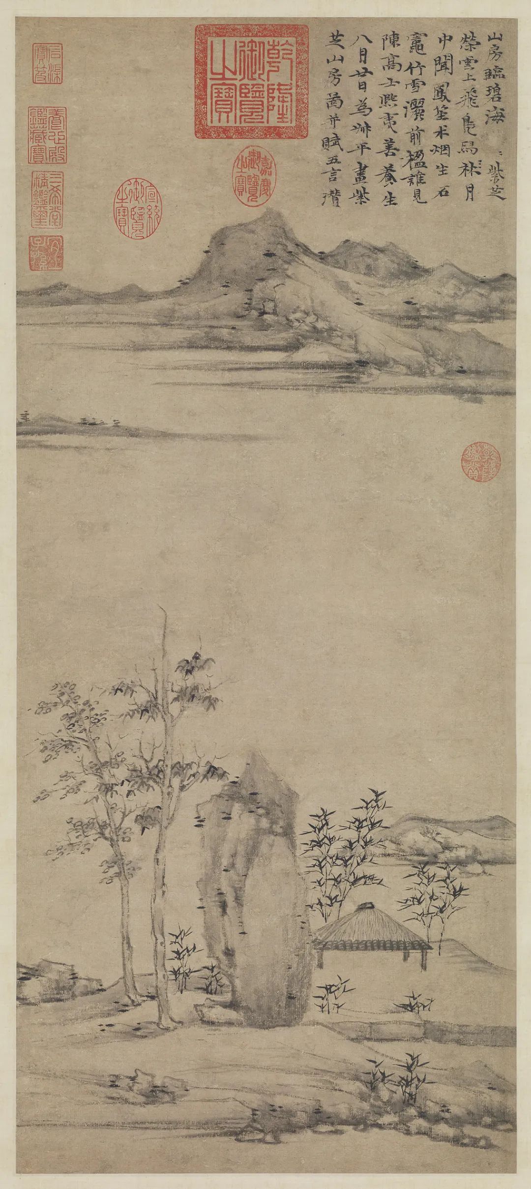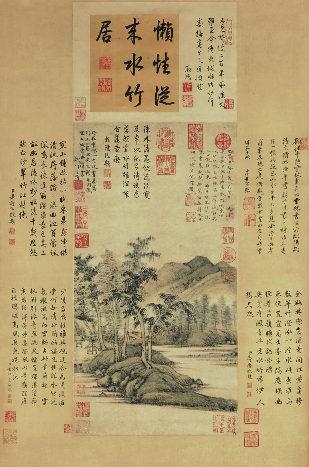 倪瓒,江苏无锡人,字元镇,号云林子,是一位有着强烈个性,且孤傲清高的隐逸文人。“天下有道则仕,无道则隐”是他的人生信条,也正是这种超然物外的处世态度,成就了他笔下那份独一无二的淡泊与宁静。他的山水画,并非对现实景物的简单摹写,而是将太湖一带的山、水、树木、竹林等元素,经过他主观的情感提炼,重新组合,营造出一种“天人合一”的意境。