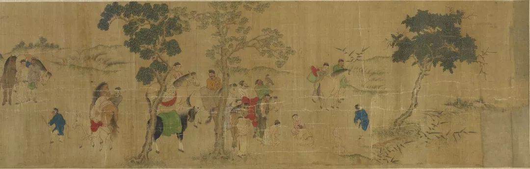 然而,更让我着迷的是钱选的山水画。元代以前,山水画多为宫廷画师所垄断,笔下多是金碧辉煌的景象。而钱选,这位落魄文人,却将家乡的湖光山色搬进了画卷。他的山水画,没有那种气吞山河的磅礴气势,却有着一种独特的清雅脱俗。他的笔触,看似随意,却又蕴含着深厚的功力;他的设色,淡雅而清丽,更显山水的清秀俊逸。那些山石,看似拙朴,却有着一种独特的装饰趣味,宛若一首古拙的诗歌。 他的《萧翼赚兰亭图卷》更是将这一特点发挥得淋漓尽致,笔下的山峦、树木,都带着一种文人画特有的稚拙感,却又在不经意间流露出一种优雅宁静的意境。