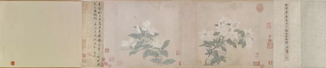 他的花鸟画,更是令人心醉。那《八花图》,八种花卉,各有姿态,却又和谐统一,展现出自然界的勃勃生机。还有那《来禽栀子花图卷》,一只小鸟轻盈地落在栀子花枝头,花鸟相映,构成一幅生机盎然的景象。那《百蝶图》,百蝶纷飞,色彩斑斓,仿佛置身于一个蝴蝶的世界,感受着自然的灵动与美好。