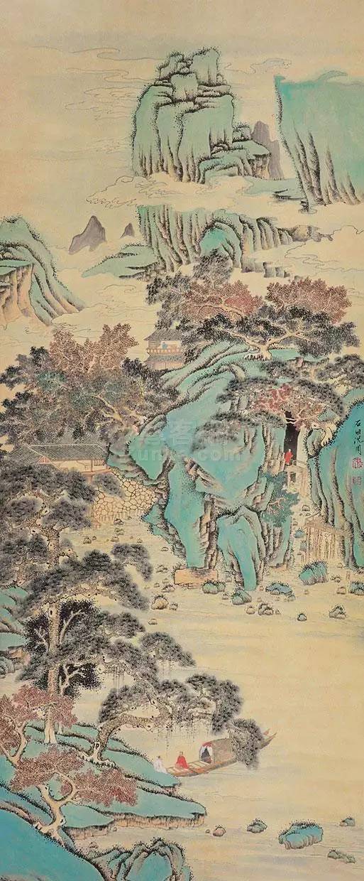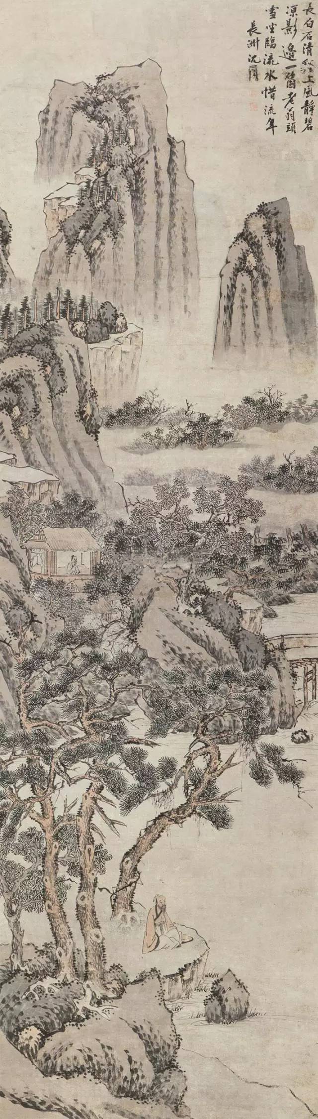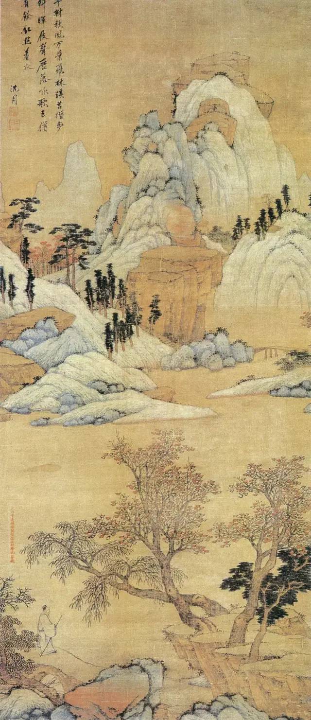 而《为祝淇作山水图》和《青山红树图》则展现了沈周另一种风貌。笔触更加洒脱,墨色更加酣畅,山石的轮廓变得更加简练,色彩也更显古朴。这是他向黄公望、吴镇学习的结果,是“细沈”向“粗沈”的过渡,是画家内心境界的升华。画中不再是精雕细琢的写实,而是更注重意境的营造,更注重情感的表达。观赏这些作品,你会感受到一种宁静致远的意境,一种超脱尘世的洒脱。