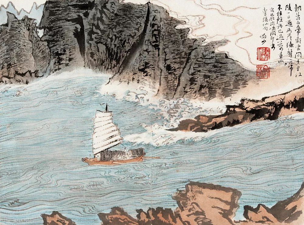 陆俨少尤擅画云水。他的云,不是简单的白描,而是浓淡相宜,层次分明,或如轻纱曼舞,或如祥云缭绕,变化万千,令人目不暇接。他的水,更是妙不可言,或奔腾咆哮,或静谧安详,皆有灵性,仿佛能听到水流的声音,感受到水的温度。这独特的“勾云、画水、墨块、留白”技法,是他长期潜心研究、不断探索的结果,是他对传统技法的继承与创新,也是他艺术风格的独到之处。