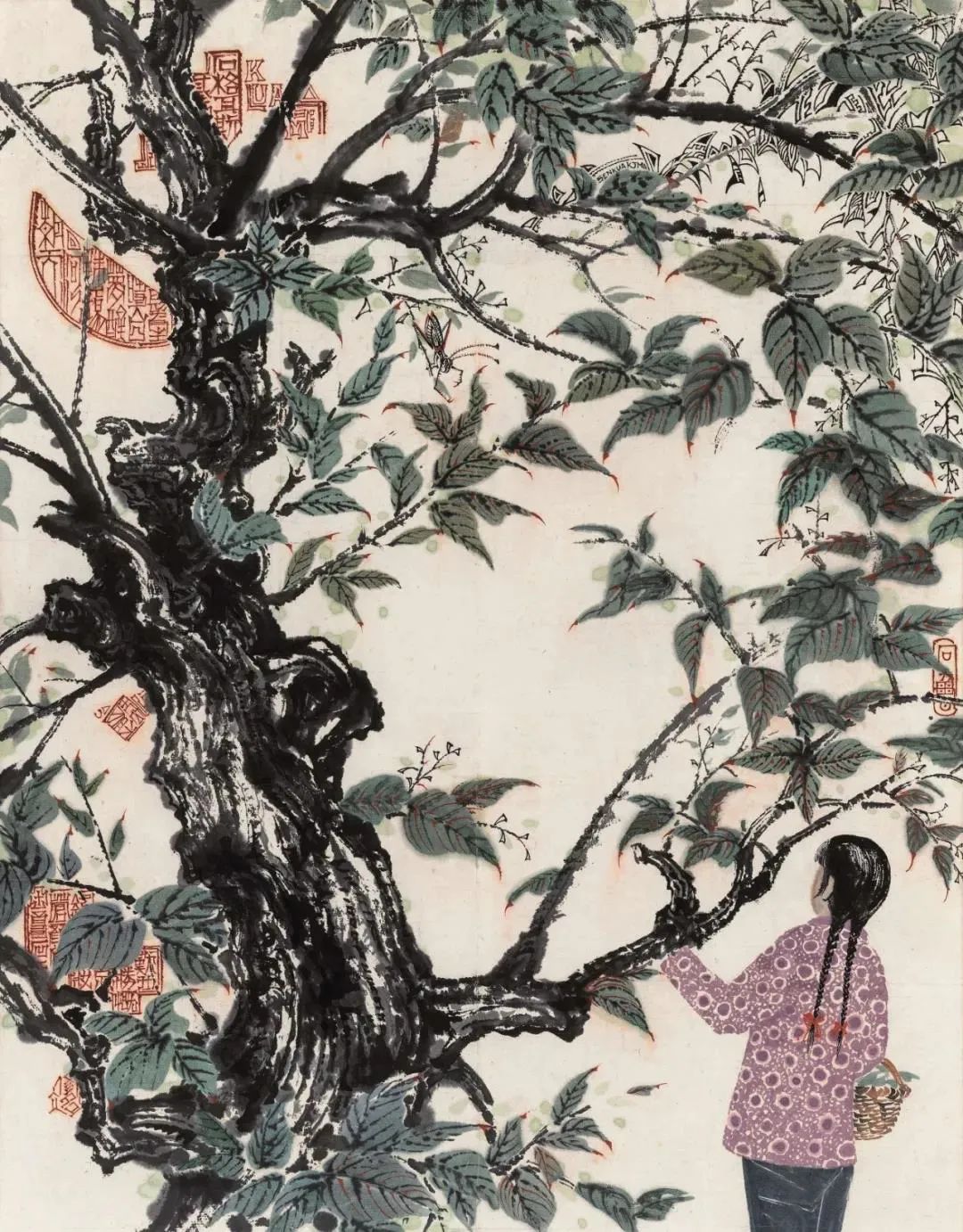 他笔下的女性形象,如《采桑图》、《采桑女》中的女子,她们的动作姿态,都充满了劳动人民的质朴与美丽。 即使是简单的静物,如《石榴》、《柿红时节》,也充满了生机与活力。 《五月风荷图》中,荷花的清雅与高原的粗犷巧妙地结合在一起,形成了一种独特的艺术张力。