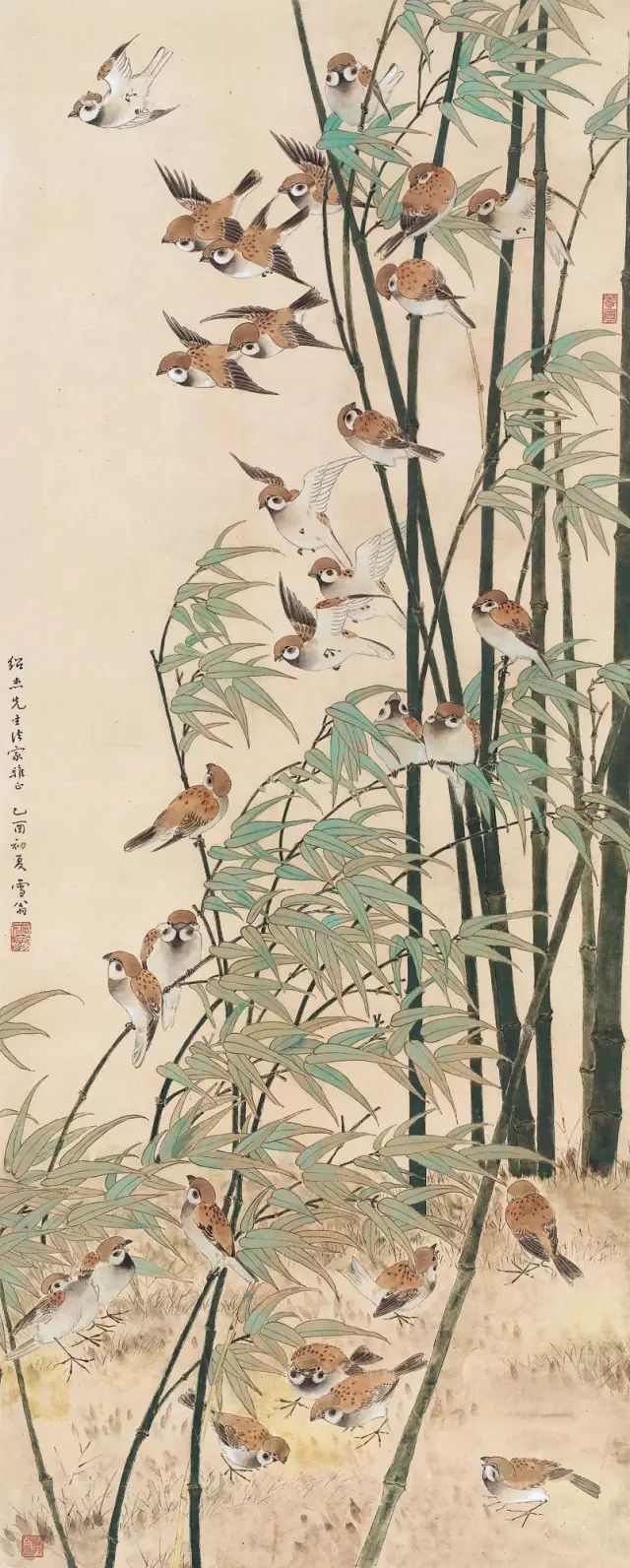 细细品读陈之佛先生的工笔花鸟画,如同漫步于一个诗意盎然的自然世界。他笔下的花鸟,并非简单的写生,而是饱含着对生命、对自然的深沉热爱与感悟。 他的作品,色彩雅致,却又明丽动人,仿佛能听到花瓣轻轻颤动的声音,能感受到鸟儿轻盈的羽翼划过空气的轻柔。 他尤其擅长捕捉鸟类的姿态与神韵,那些寻常可见的麻雀,在他的笔下,也变得生动鲜活,灵性十足。 不再只是简单的停留在枝头,它们仿佛有了自己的故事,在无声地诉说着属于它们的喜怒哀乐。