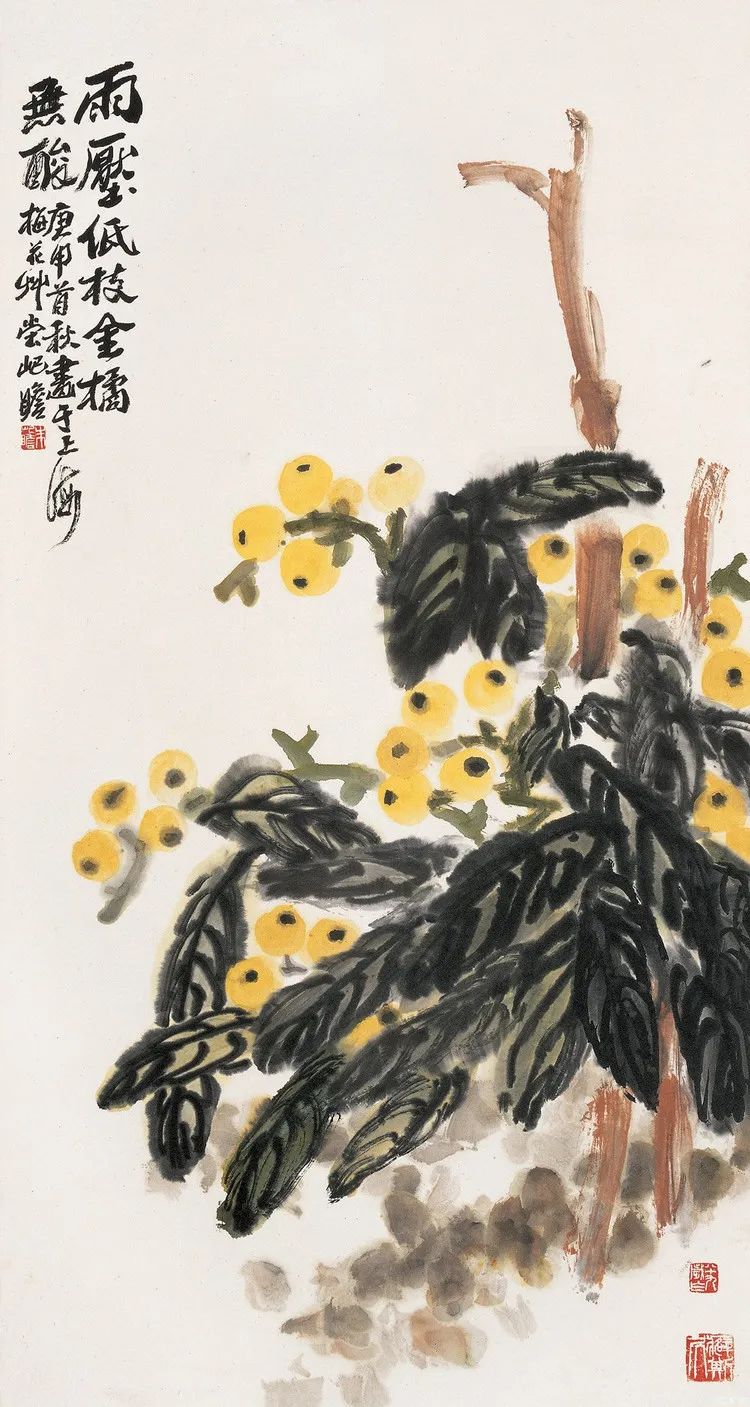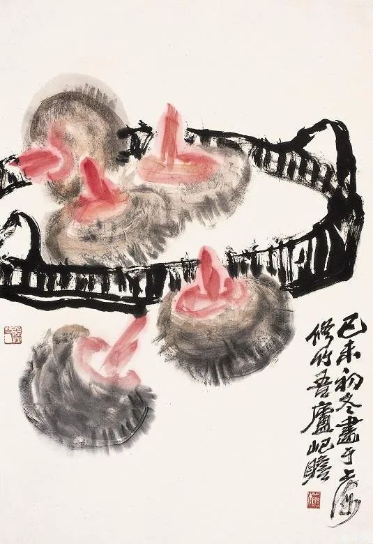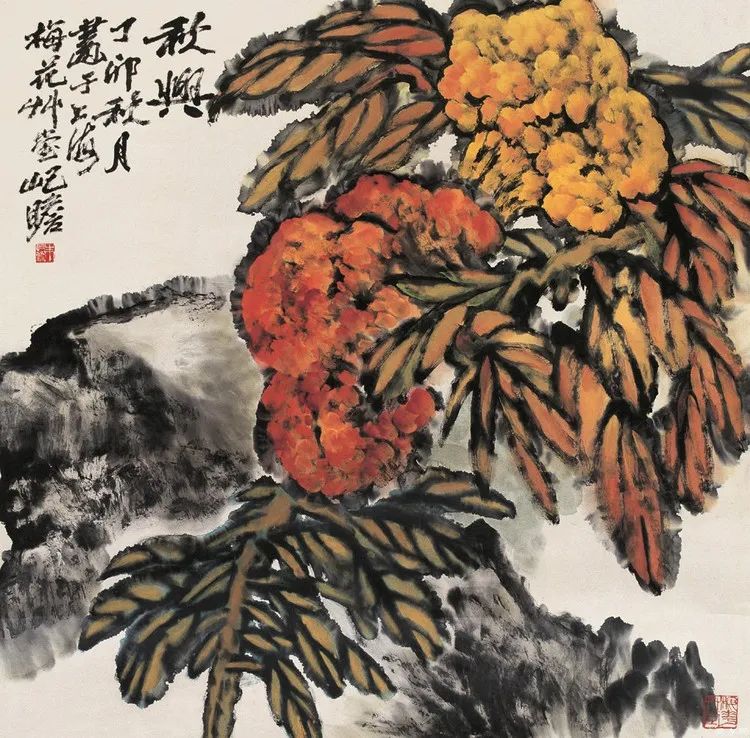 再看那《初日照丹枫》,初升的太阳将金色的光芒洒向枫叶,红叶似火,温暖而热烈,仿佛预示着新生的希望。这种对光影的运用,恰恰体现了他早期学习油画的功底,却又完全融入了中国画的写意精神,使画面生动而富有感染力。
