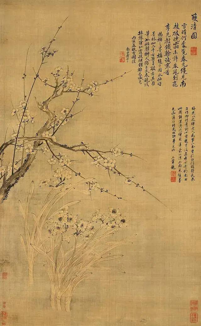 恽寿平的《双清图》,笔墨轻盈,色调淡雅,仿佛一曲清丽的江南小调,在耳畔轻轻回旋。那梅枝疏影横斜,兰叶亭亭玉立,清风拂过,似有幽香飘来。而石涛的《双清图》和《岁寒双清图》则另有一番豪迈洒脱,笔法奔放,墨色浓重,仿佛一位高士傲立寒冬,不畏严寒,傲然挺立。 那种坚韧不拔的品格,跃然纸上,令人肃然起敬。