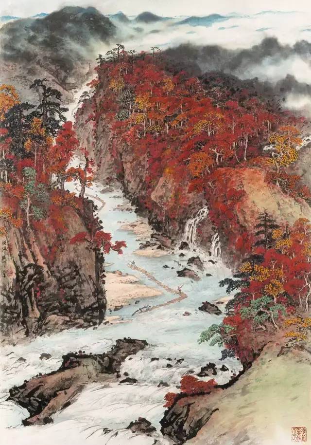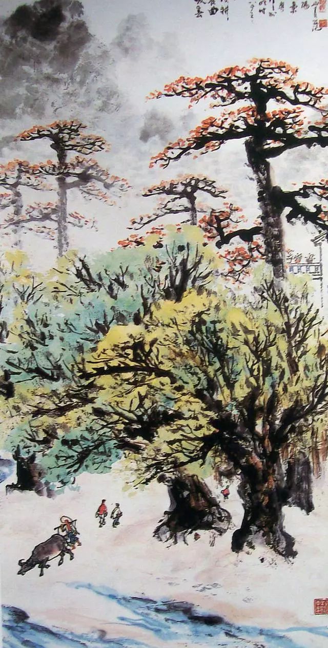 《秋溪放筏》,画面如诗如歌,秋水澄碧,山峦叠翠,木筏轻盈地漂浮其间,仿佛时间也放慢了脚步。这种宁静致远的意境,让人不禁想起陶渊明笔下的世外桃源,心中泛起一股淡淡的诗意。而《绿色长城》,则以磅礴的气势,展现了祖国壮丽的山河和人民建设家园的豪情壮志。那浓墨重彩的绿色,仿佛蕴藏着无限的生命力,令人心潮澎湃。