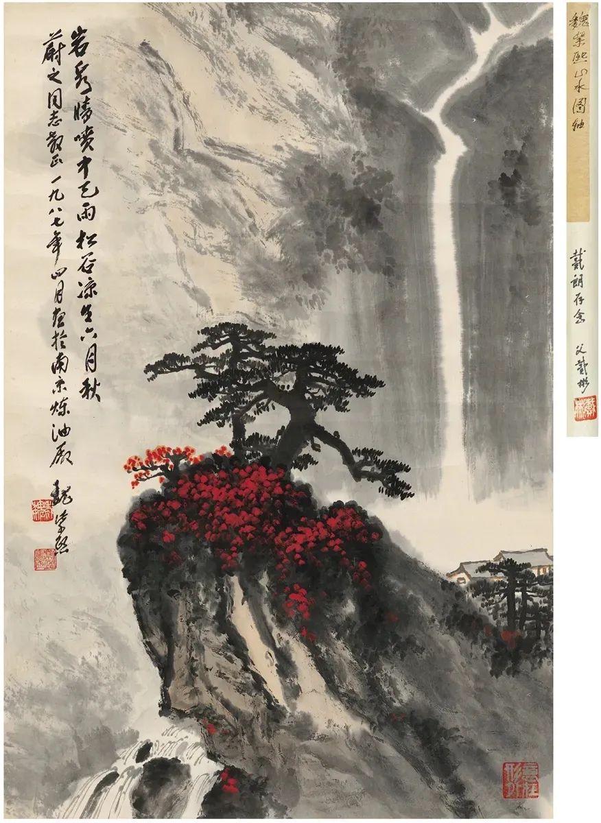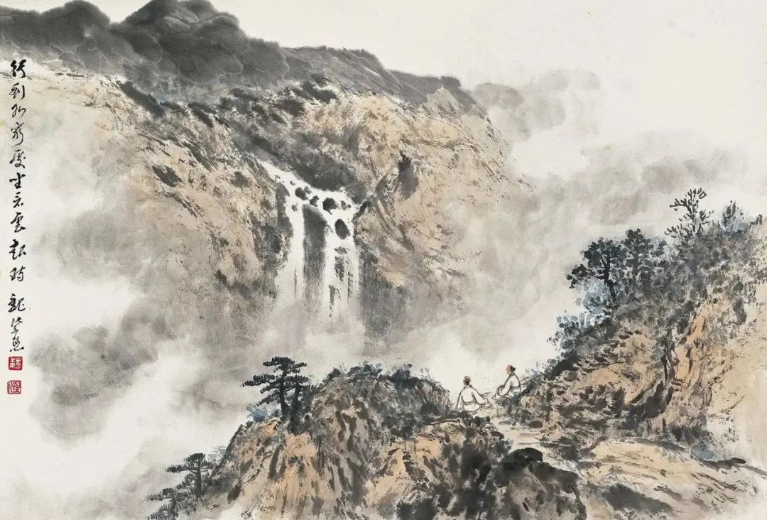 魏先生早年师法王石谷,汲取其清丽深秀之韵,后又潜心研习南宋诸家,刘松年、马远、夏圭的笔法在他的画中融汇贯通,苍劲严整,墨气明润,却又自成一家。 他并非拘泥于古法,更将日本画的写意风格融入其中,大笔挥洒,水墨淋漓,水渍明晰,将简略的形象巧妙地笼罩在幽美的氛围里。 这是一种怎样的境界啊!仿佛山风拂面,轻柔而坚定,山间的溪流蜿蜒流淌,清澈见底,带着丝丝凉意。
