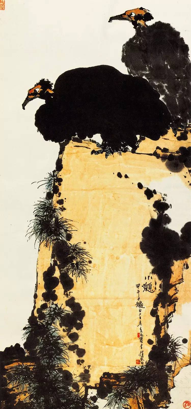 欣赏潘天寿的《松鹰图》,仿佛置身于高耸入云的松林之中,感受着清冽的松风,以及那鹰隼锐利的目光。鹰身挺拔,目光如炬,它与苍松构成一幅气势恢宏的画面,象征着一种坚韧不拔的生命力。而他的指画作品《鹫鹰磐石图》,则更显出一种凝重与力量,鹰立于磐石之上,仿佛在凝视着远方,那沉稳的姿态,令人肃然起敬。