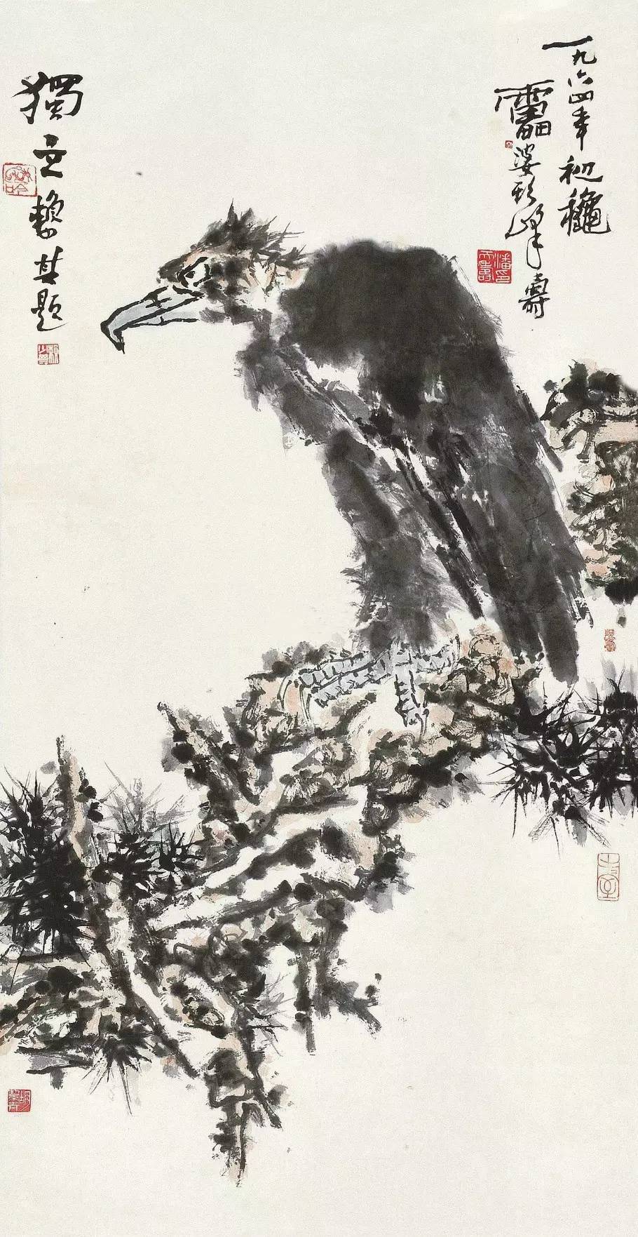 然而,要论及潘天寿最令人心折的作品,恐怕要数他笔下的鹰鹫了。这些雄健的猛禽,栖息于高山峻岭,眼神锐利,气势逼人,与潘天寿本人豪迈不羁的性格竟是如此契合。他笔下的鹰,并非简单的写实,而是将鹰的雄强、独立、不屈的品格,与自身的艺术追求完美融合。 那强劲有力的线条,浓墨重彩的晕染,仿佛都能感受到鹰羽下强劲的搏动,以及它俯瞰山河的傲然姿态。