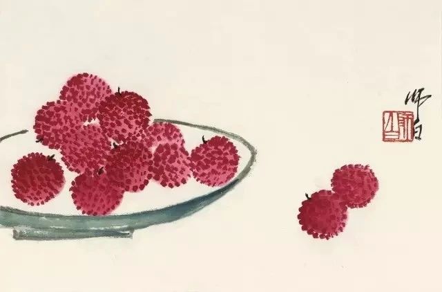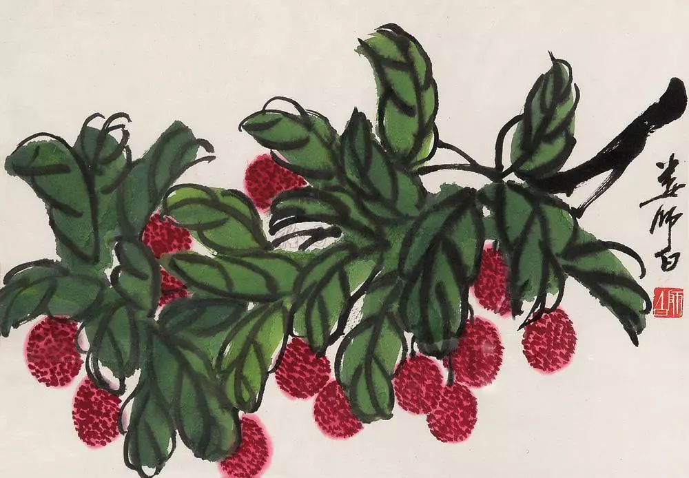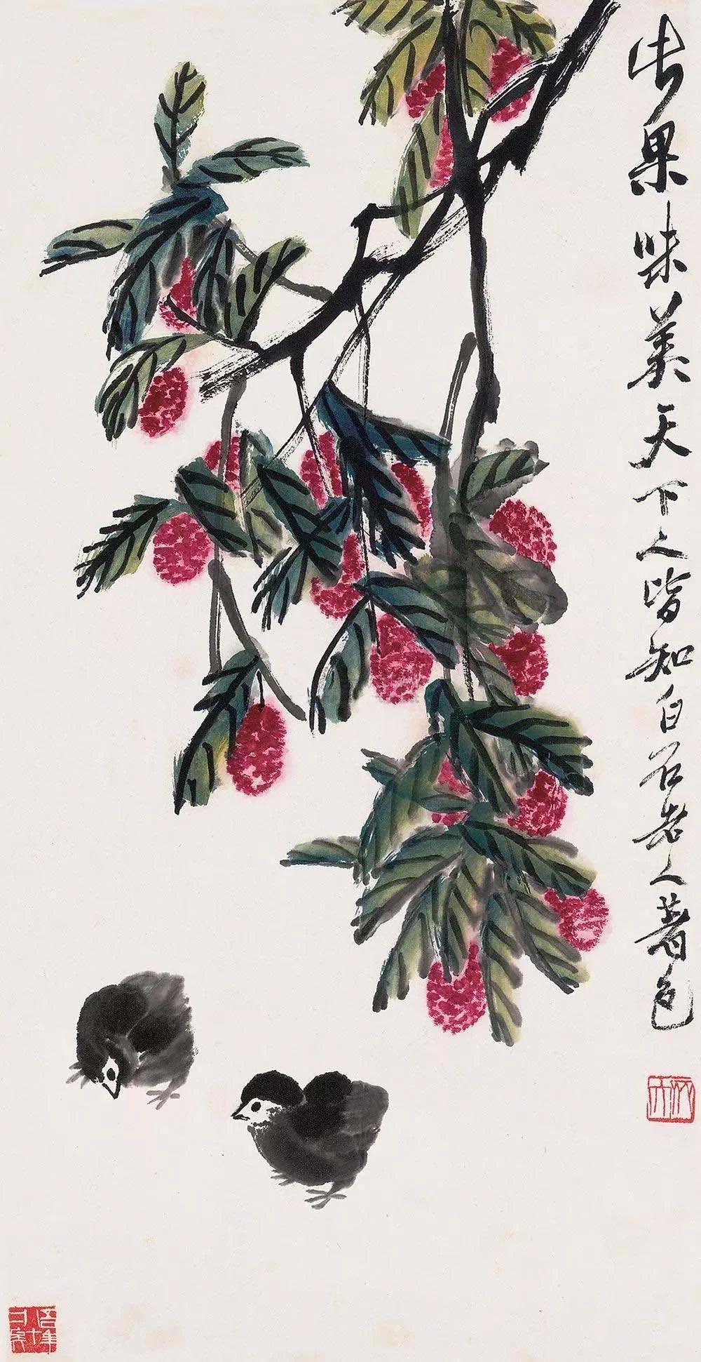 时光流转,来到近现代,齐白石先生的荔枝图便展现出截然不同的风格。他笔下的荔枝,寥寥几笔,便勾勒出果实的饱满圆润,或与小鸡相伴,构成一幅生机盎然的小品;或单独成画,以其独特的红、绿、黑三色,营造出一种朴实而充满趣味的意境。那鲜艳欲滴的色彩,似乎都能闻到荔枝的甘甜。