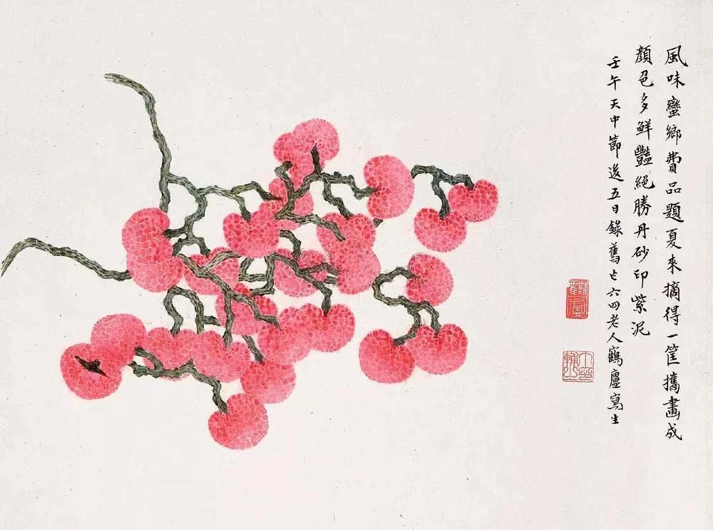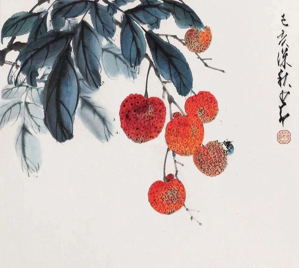 而岭南画派画家容漱石先生的荔枝图,更是令人惊艳。他笔下的荔枝,仿佛拥有生命一般,鲜艳欲滴,饱满多汁。几笔勾勒,便将荔枝的形态、质感、色泽展现得淋漓尽致。那些与小鸟相伴的荔枝图,更是生动有趣,仿佛将夏日午后的宁静与活力,都浓缩在小小的画幅之中。他笔下的荔枝,不只是简单的果实描绘,更像是一种生命力的象征,蓬勃向上,充满生机。每一幅作品都洋溢着浓厚的岭南气息,让人感受到南国特有的热情与活力。