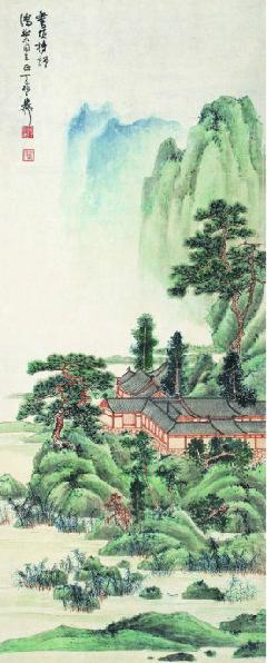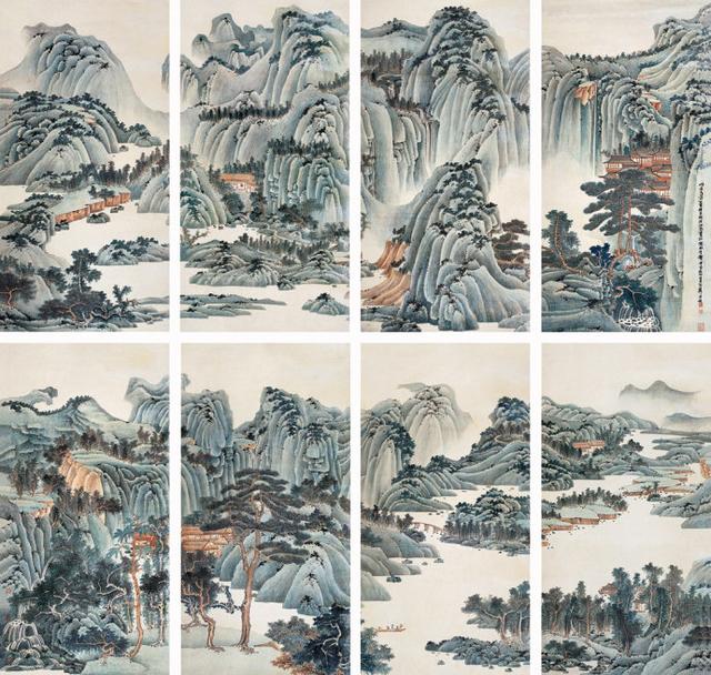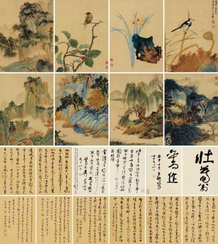 谢稚柳先生的山水画,并非一蹴而就的辉煌,而是经过了长期的潜心学习与不断探索才最终成就的艺术高峰。他早年师法北宋大家范宽,汲取其雄伟壮阔的风格,又融入了燕文贵和王诜的清秀温婉,最终形成了自己独特的艺术语言——雄浑与细腻和谐共存,大气磅礴中透着文人画的清雅逸致。他的笔下,山峦层叠,云雾缭绕,山石的皴擦,树木的点染,都精细入微,却又浑然天成。仿佛置身于画卷之中,感受着山风的轻拂,云雾的飘渺,以及那份宁静致远的心境。那些青绿山水通景,如同展开的巨幅画卷,将江南的秀美风光尽收眼底,每一处细节都精雕细琢,令人叹为观止。而那些仿宋山水花鸟册页,则更显秀丽灵动,仿佛将一幅幅江南的诗意小景轻轻地展现在你面前。