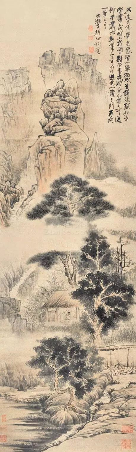 在他的画中,我们可以感受到一种独特的意境。那是一种充满诗情画意,又略带几分禅意的意境。仿佛置身于幽静的山谷,聆听着松涛的低吟,感受着清风的轻拂。这种意境,并非是刻意营造的,而是石涛自然流露的情感,是他在与天地对话,在与自我对话。