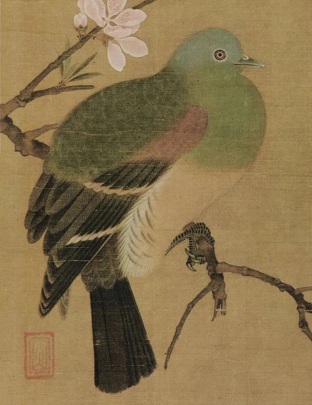 《桃鸠图》里,粉红的桃花烂漫盛开,枝头栖息着一对灵动的斑鸠,羽毛的细致纹理,几乎能感受到它们轻盈的体态。那是一种怎样温柔的笔触,才能将生机勃勃的春意如此细腻地捕捉?仿佛能闻到桃花的馨香,听到斑鸠轻柔的低语。画面中没有喧嚣,只有静谧与和谐,如同春日午后的一场无声的诗歌吟诵。