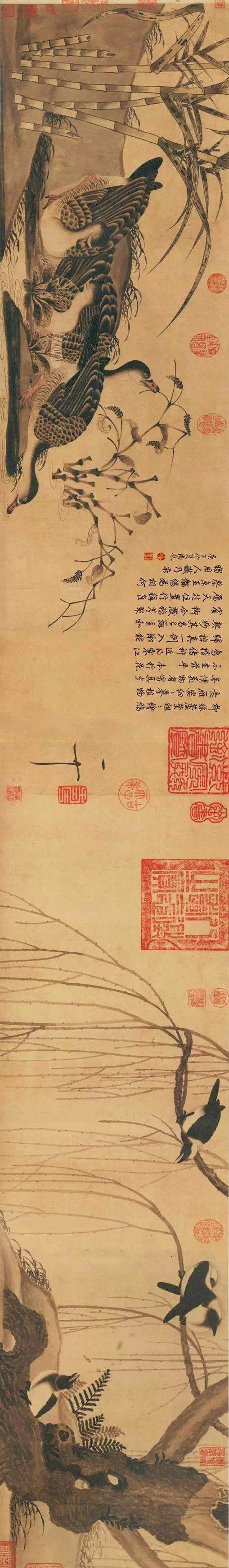而《柳鸦芦雁图》则展现了另一种意境,水墨晕染的芦苇荡,几只芦雁悠然自得,几只乌鸦静立枝头。这是一种宁静致远的境界,与前几幅画作的繁华形成了鲜明的对比,却同样令人沉醉其中。这或许是宋徽宗在权力巅峰之外,对自然,对生命的另一种体悟。