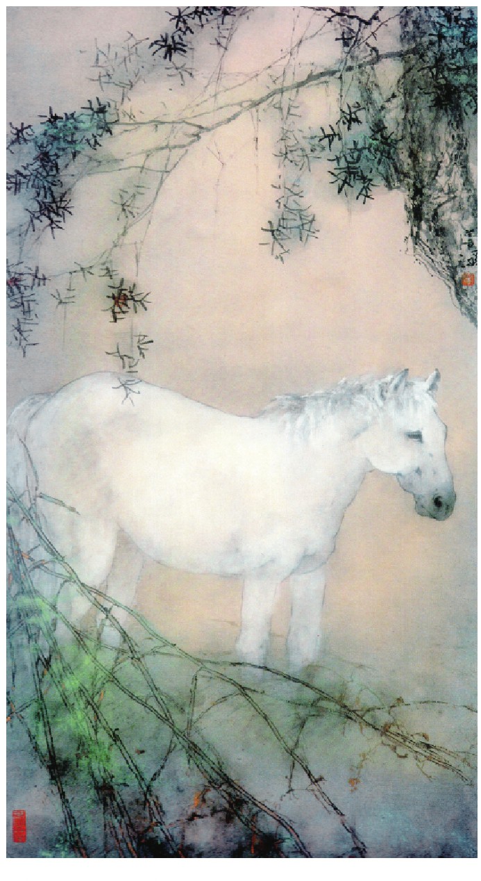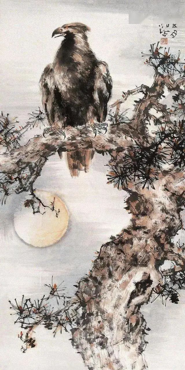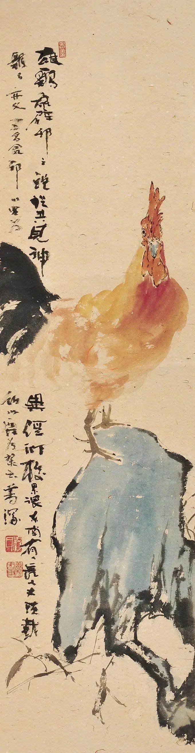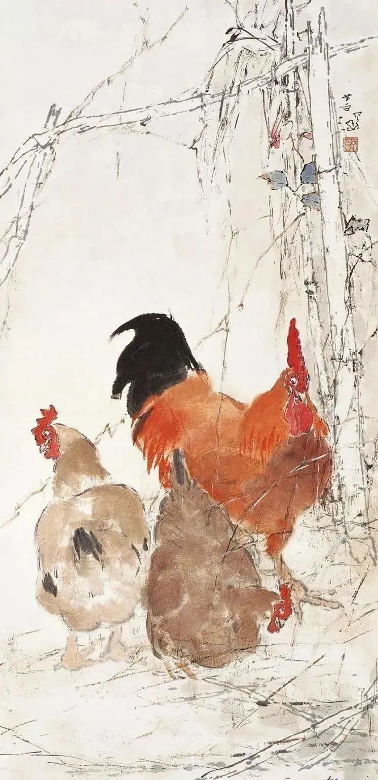 相比之下,他的花鸟作品则更显中国画的笔意。浓淡干湿的墨色,在枝干、竹叶间肆意流淌,如同清泉般滋润着画面。一抹朱砂,点缀在鸡冠或花瓣上,与水墨的沉静形成鲜明的对比,却又和谐统一,如同音律的抑扬顿挫,更显灵动。这是一种色彩的交响,也是心灵的对话。