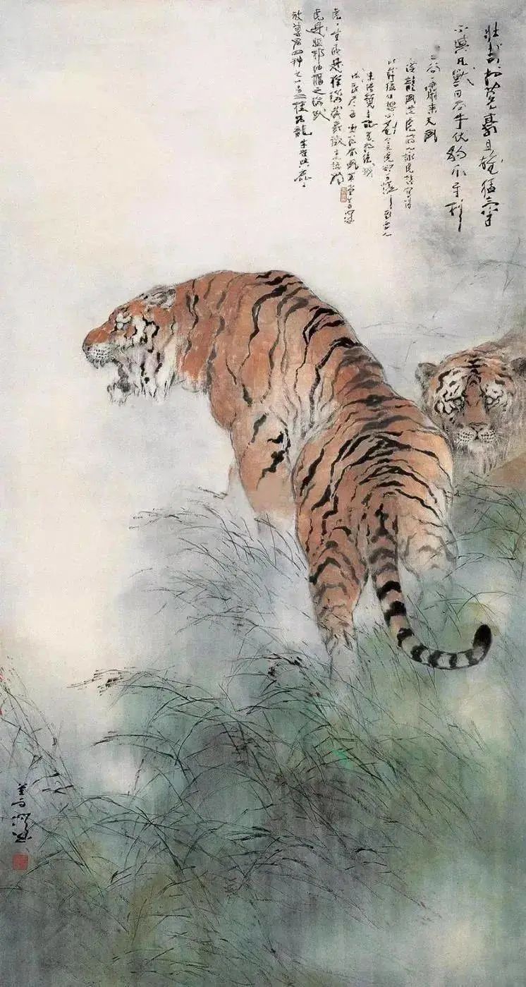 初见杨善深先生的走兽图,便会被那细腻的笔触所吸引。那些或憨态可掬的猴子,或威风凛凛的猛虎,或温顺可爱的兔子,仿佛都跃然纸上,栩栩如生。他以精湛的技法,捕捉住动物的神韵,无论是毛发的质感,还是眼神的光芒,都刻画得入木三分。而背景中朦胧的晕染,更增添了几分神秘感,仿佛将观者带入一个奇幻的动物世界。早年游学日本的经历,在他的作品中留下了淡淡的痕迹,却并没有掩盖其独特的个人风格,反而更添一份异域风情。马、猴、虎、猫、豹、牛,甚至是常见的猪,在他的笔下都摆脱了动物本身的局限,昇华成一种艺术的象征。