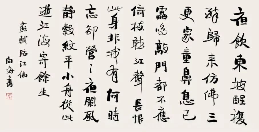 苏轼的《临江仙》,则充满了豪迈之气。雄浑的笔力,奔放的线条,将词人的豁达与洒脱展现得淋漓尽致。“小舟从此逝,江海寄余生”,这是一种何等的人生境界!荆先生的书法,仿佛一艘乘风破浪的小舟,载着我们驶向诗意的远方。