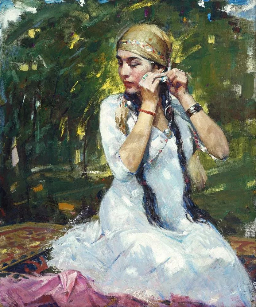 他早年留学列宾美术学院的经历,无疑为他打下了坚实的绘画基础。然而,真正让他的艺术焕发出独特光彩的,是他对新疆少数民族的深情描绘。那些饱经风霜的面孔,那些清澈明亮的眼神,那些绚丽多彩的服饰,在他的画布上,构成了一幅幅动人的生命图景。