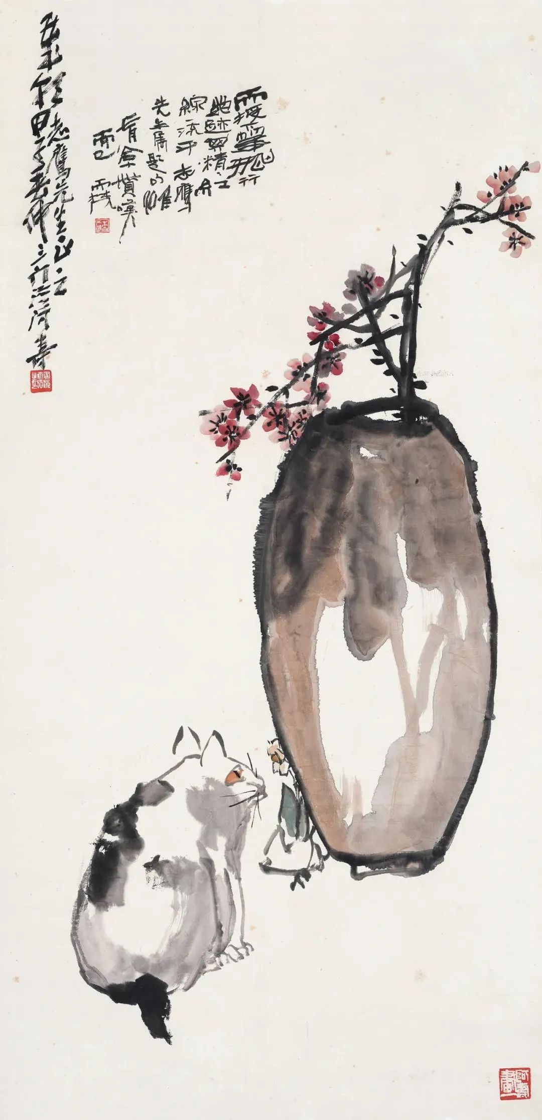 《花狸奴图轴》中,一只猫咪慵懒地趴在石头上,眼神灵动,姿态优雅,充满了生活的气息。
