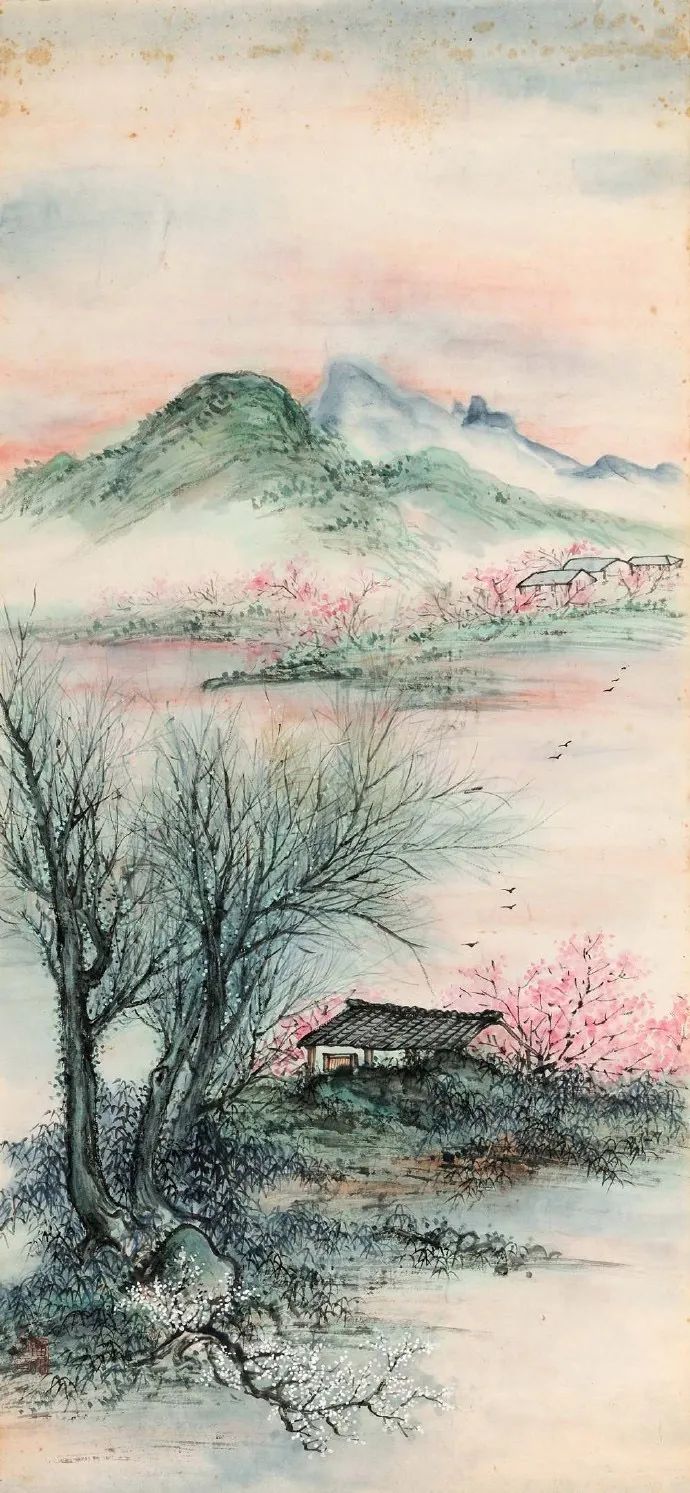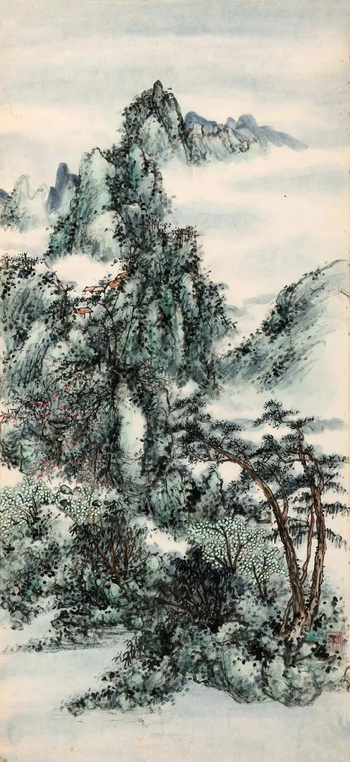 他尤爱画云,那云不是静止的,而是流动的,是呼吸的。它们或轻盈如纱,或厚重如棉,或聚散无常,或变幻万千。它们在山间飘荡,在水中倒影,将整个画面都笼罩在一片朦胧之中,营造出一种空灵、神秘的氛围。
