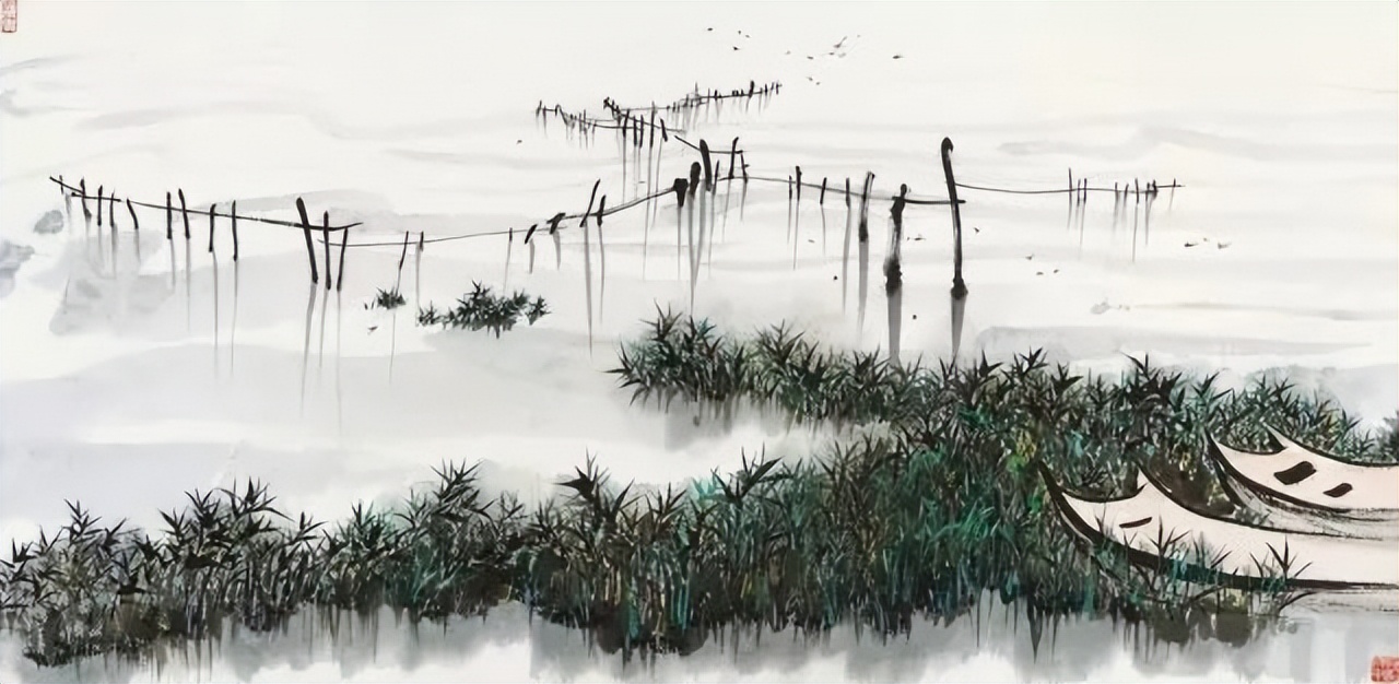 《翠竹渔艇》中,翠绿的竹林与碧蓝的湖水交相辉映,一叶扁舟静静地漂浮在水面上,营造出一种宁静而悠远的意境。