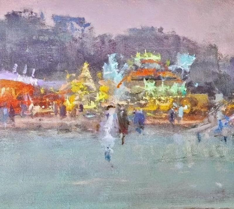 我最爱的,是他描绘威尼斯的作品。水城威尼斯,在他的笔下,褪去了往日的喧嚣与繁华,展现出一种宁静祥和的美。古老的建筑倒映在水中,波光粼粼,如梦似幻。贡多拉在水中静静地滑行,留下道道涟漪,仿佛在诉说着这座城市古老的故事。他笔下的威尼斯,不是一个旅游胜地,而是一个充满诗意和浪漫的地方,令人心驰神往。