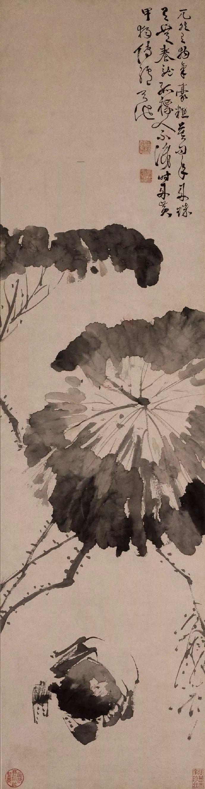 首先要说的,是明代的狂放才子——徐渭。他的《墨葡萄图》尽人皆知,而他笔下的荷花,也同样令人惊叹。不同于工笔的精细描摹,徐渭的大写意荷花,是淋漓的墨色挥洒,是豪迈的气势奔涌。你看那《墨荷图》,墨色晕染,浓淡交织,荷叶仿佛在风中摇曳,带着一股遮天蔽日的生命力,直冲云霄。而在《黄甲图》中,墨色的荷叶与点缀其间的黄色莲蓬相映成趣,更添几分野逸之趣。