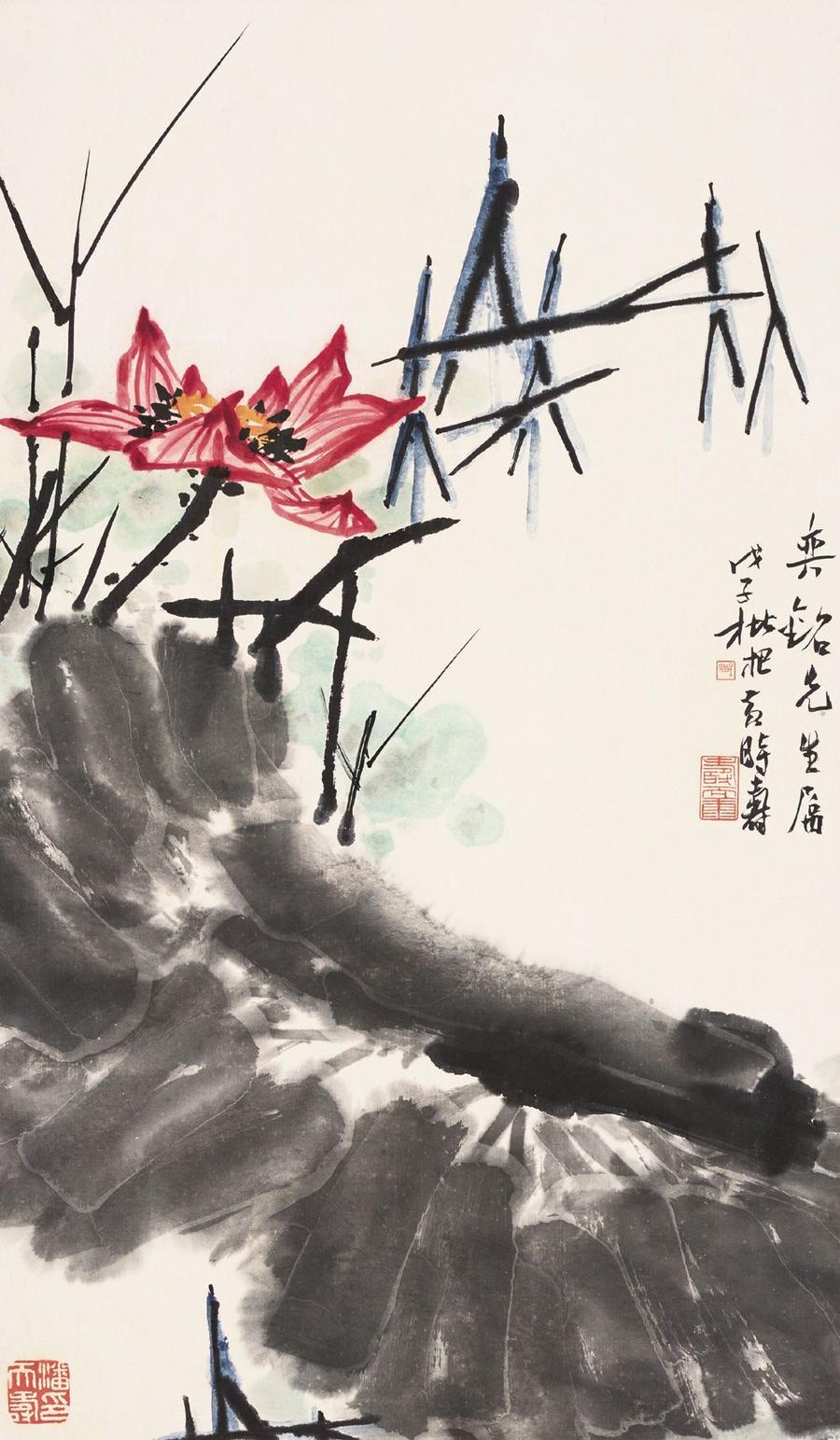 最后,让我们一同欣赏潘天寿的荷花世界。他的荷花,笔墨苍古、凝炼老辣,带着一种雄浑奇崛之美。“接天莲叶无穷碧,映日荷花别样红”,这句诗用来形容潘天寿的荷花再合适不过。在《露气》中,荷叶上晶莹的露珠,仿佛在诉说着生命的活力。而《红荷》则是一片热烈的红色,充满着蓬勃的生命力,仿佛要燃烧整个画面。在《荷花水鸟》中,荷花与水鸟和谐共生,构成一幅宁静而美好的画面,让人感受到大自然的和谐与宁静。