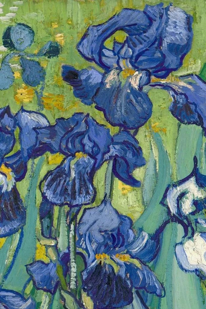 圣雷米的鸢尾花,则带着一丝淡淡的忧伤。在精神病院的疗养期间,梵高将内心的孤独和不安,倾注于笔下的鸢尾花。那鲜丽的色彩中,透露出淡淡的忧郁,微微低垂的花瓣,仿佛在诉说着内心的挣扎。每一朵鸢尾花,都是独一无二的,梵高用他独特的笔触,描绘出花瓣的曲线、扭转和卷边,展现出他对生命细致入微的观察和感悟。法国艺术评论家Octave Mirbeau曾感叹梵高对花卉精妙本质的理解,而这份理解,源于他对生命的热爱和对美的执着追求。
