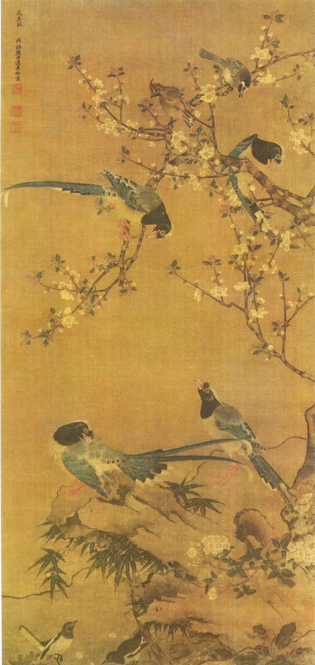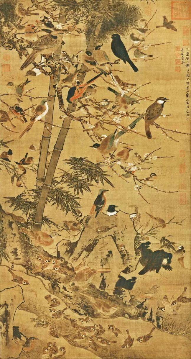 边景昭的花鸟画,继承了宋代院体画的精髓,却又融入了自己的独特风格。《花竹聚禽图》,色彩艳丽,花鸟栩栩如生,仿佛能闻到花香,听到鸟鸣。那细腻的笔触,将花瓣的纹理、鸟羽的光泽都描绘得淋漓尽致,令人叹为观止。台北故宫博物院藏的那幅长卷,更是将花鸟世界的繁华景象展现得淋漓尽致,令人目不暇接。