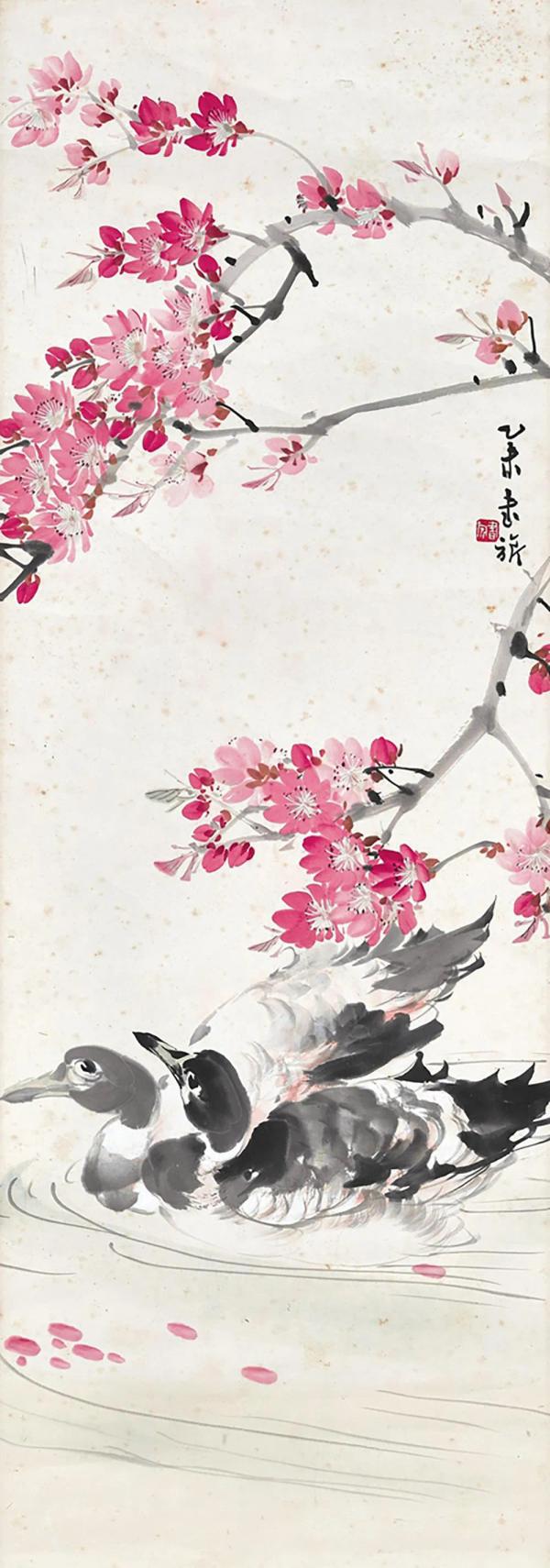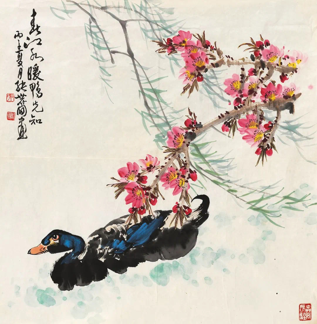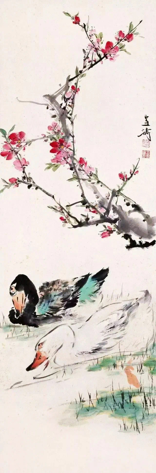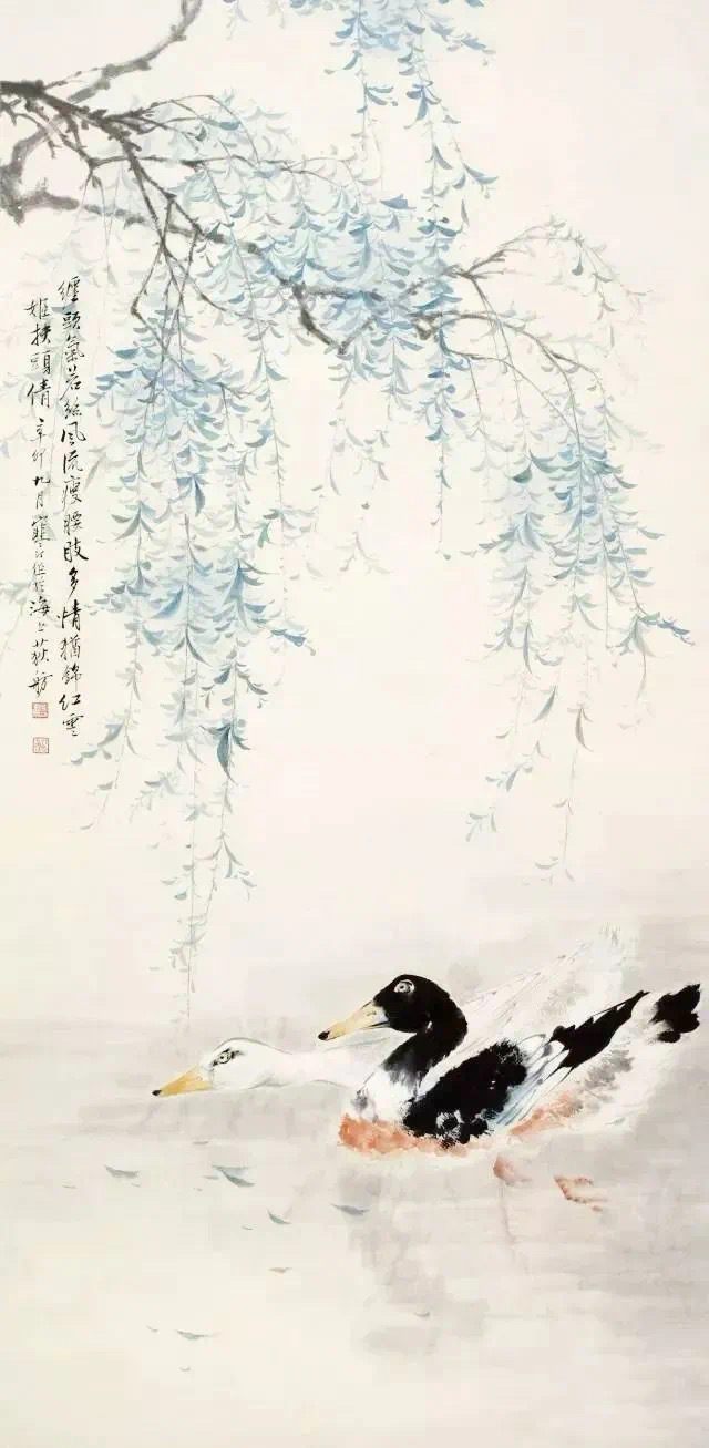 画家的笔墨运用,更是令人叹为观止。寥寥数笔,便勾勒出鸭子的灵动,几抹淡彩,便晕染出江水的波光粼粼。那看似简单的线条,却充满了力量和韵律,每一笔都饱含着画家对自然的热爱,对生命的敬畏。