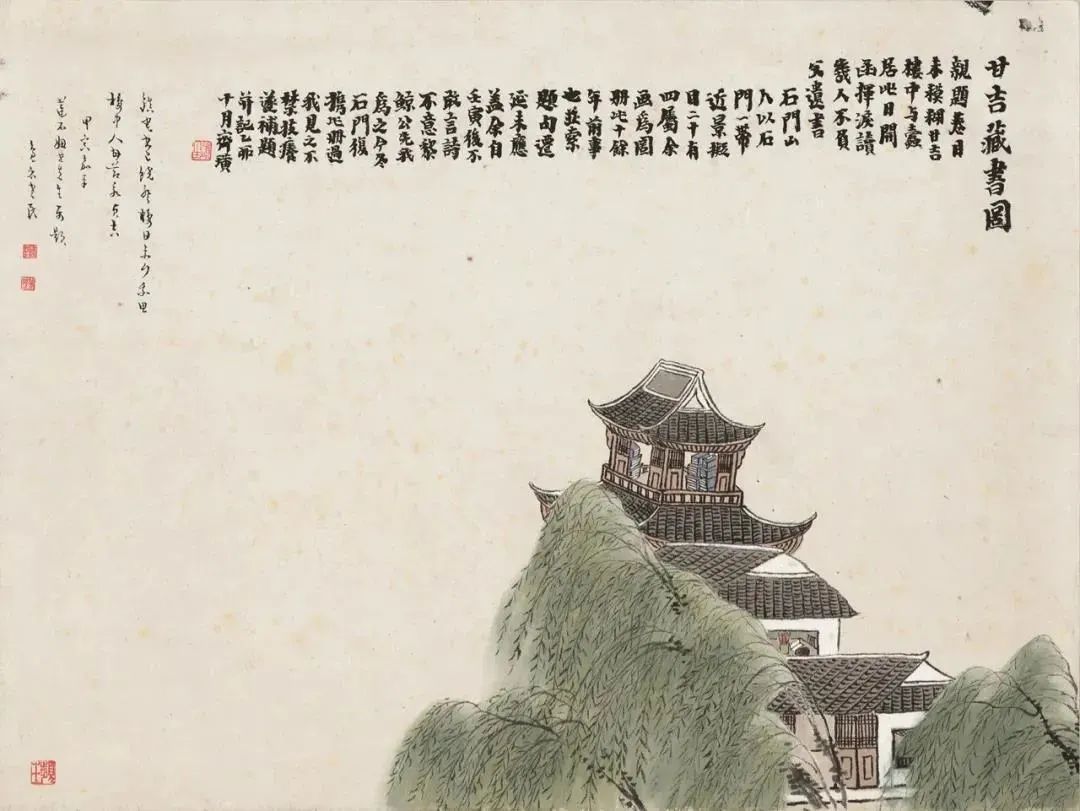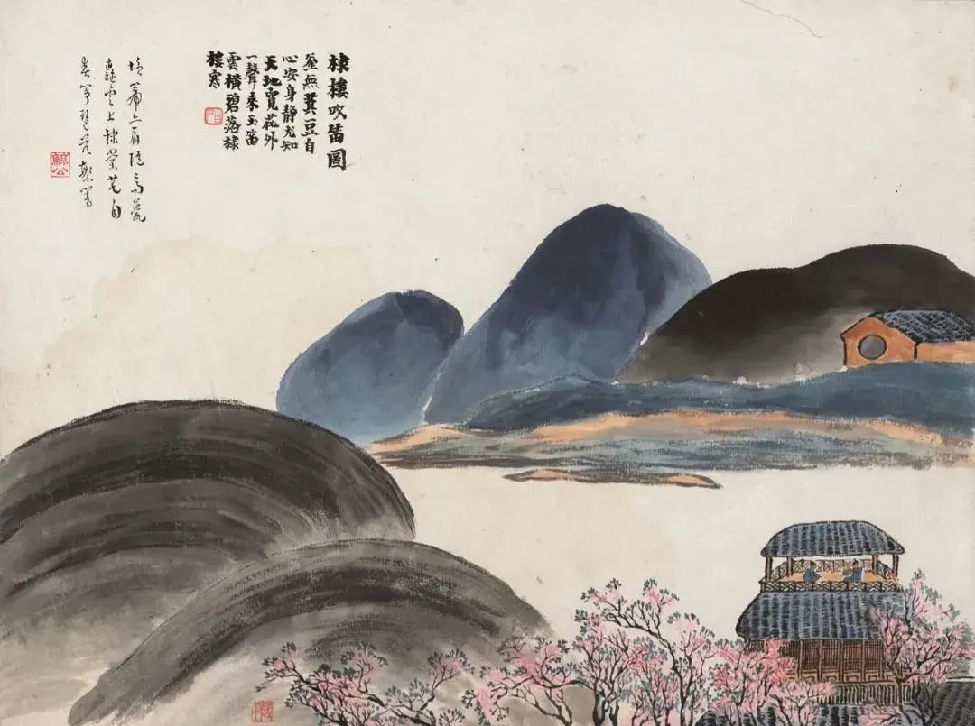 《棣楼吹笛图》中,悠扬的笛声在花间飘荡,笛声穿透云层,回响在碧落之间。那“花外一声闻铁笛,云横碧落棣楼寒”的诗句,更是将笛声的清冷和意境的悠远描绘得如诗如画。