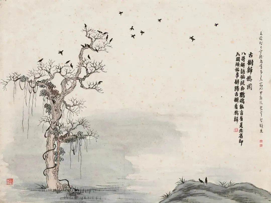 《古树归鸦图》里,斜阳西下,群鸦归巢,古树静默。这幅画并非描绘热闹的景象,而是呈现一种宁静的氛围,让人感受到一种“省却人间烦恼事”的淡泊心境。