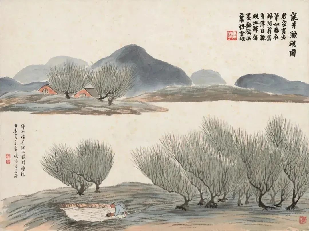 《龙井涤砚图》展现的是文人雅士的日常生活,洗砚、挥墨,于井中汲水,仿佛也在洗涤心灵,感悟自然。那“日洗砚池挥宿墨,好从井裏悟云烟”的诗句,更是将这种意境表达得淋漓尽致。