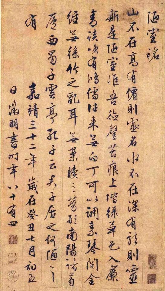 偶然翻阅到文徵明先生八十四岁高龄时书写的《陋室铭》行书,内心不禁为之一震。八十四岁,本是颐养天年的年纪,却依然能挥毫泼墨,留下如此沉稳含蓄、充满生命力的作品,怎能不令人叹服?这幅作品,于我而言,如同初春的嫩芽,于寒冬中蕴藏着无限生机,又像深秋的落叶,于静谧中展现着生命的圆融。