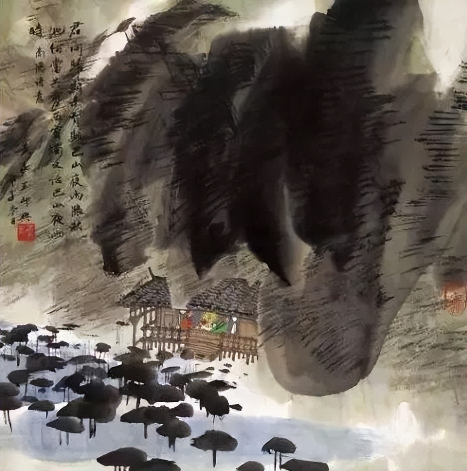 他笔下的山,不再是规规矩矩的轮廓,而是浓墨重彩堆叠出的奇峰怪石,仿佛是从远古神话中走来,带着一股原始而神秘的气息。有时,大片大片的黑色占据着画面,却并不让人感到压抑,反而像是在无尽的黑暗中孕育着无限的生命力,计黑当白,反倒显出一种独特的空灵。