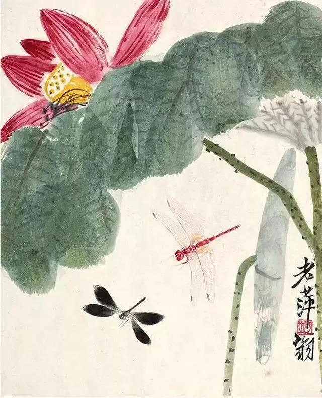 再看那幅荷花图,奇崛的构图,稚拙可爱的荷叶与荷花,营造出一片清凉宁静的世界。两只蜻蜓在荷叶下盘旋,虽然听不到翅膀扇动的声音,却能感受到它们轻盈的舞姿。这无声的律动,更激发了观者无限的遐想,仿佛自己也变成了其中的一只蜻蜓,在荷塘间自由飞翔。
