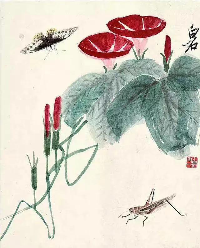 还有那牵牛花,沿着对角线蜿蜒生长,将画面分割成不同的层次。一只蝴蝶在花朵上方飞舞,而一只草蜢则在花朵的另一侧觅食,它们都被盛开的牵牛花所吸引。这简单的画面,却充满了生机与活力,展现了自然界弱肉强食的生存法则,也展现了生命的美好与脆弱。