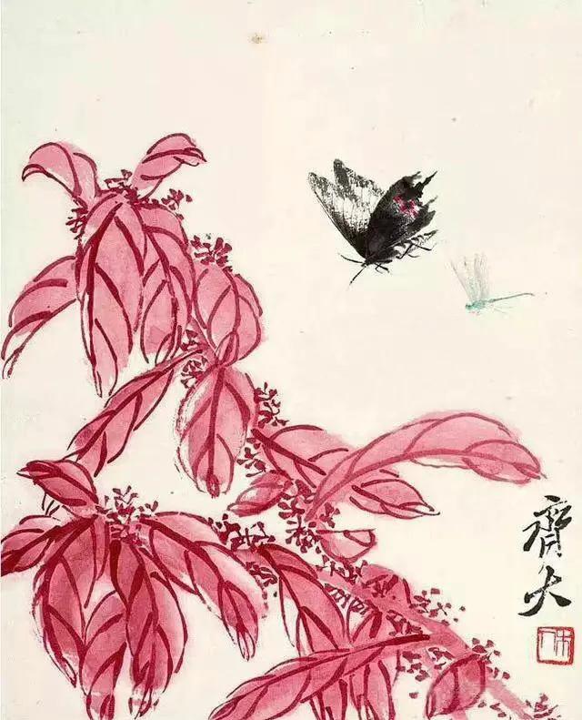 你看那雁来红,如点点胭脂散落在纸上,一只蝴蝶翩翩起舞,正欲飞向这片火红,而一只蜻蜓早已停驻其上,透明的翅膀在阳光下闪着微光。疏密有致的构图,动静结合的画面,将乡间小景的轻快与美好展现得淋漓尽致,令人心生向往。仿佛置身于田野之中,感受着微风的轻抚,闻着花草的芬芳。