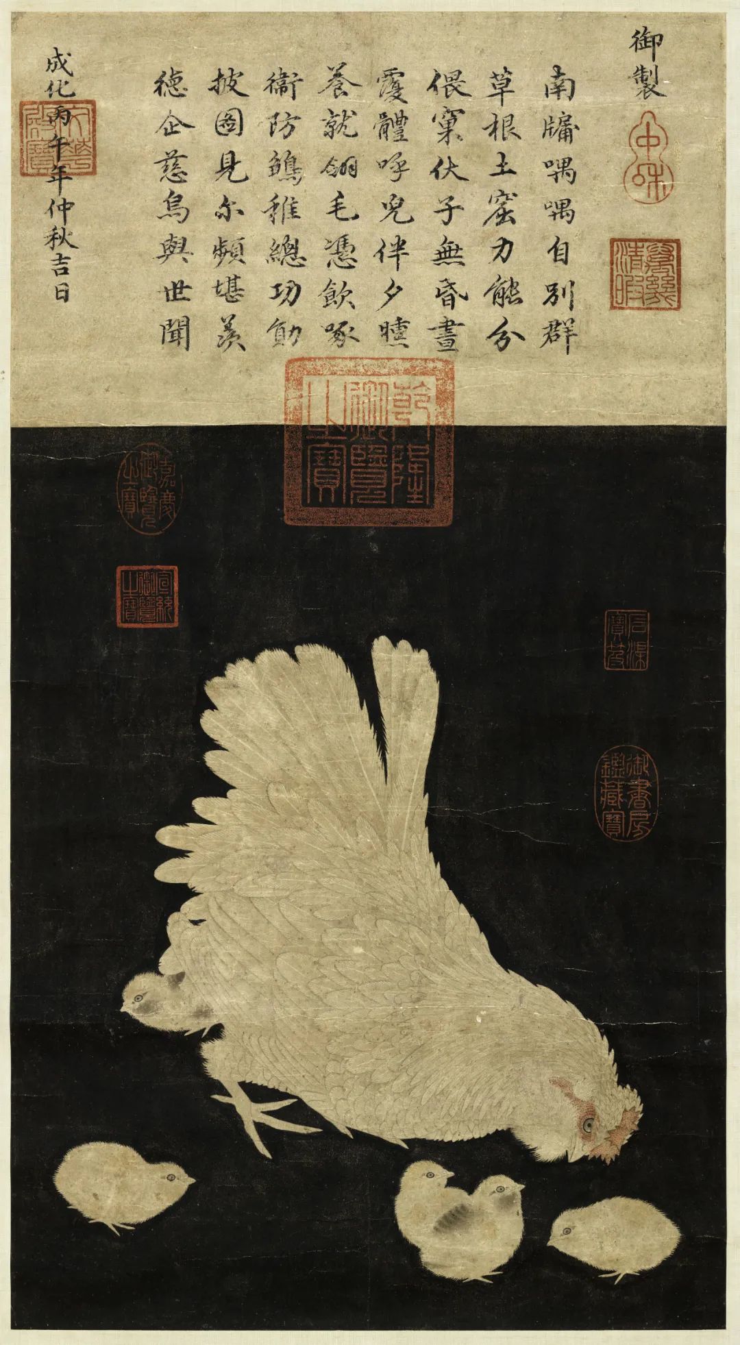 另一幅描绘鸡的画作,虽然作者佚名,却也散发着独特的魅力。这幅《子母鸡图》以其温馨的画面和丰富的寓意吸引着我的目光。雪白的母鸡带领着五只毛茸茸的小鸡,在一片漆黑的背景中觅食,形成强烈的视觉对比。母鸡的目光充满了慈爱,蓬松的羽毛仿佛散发着母性的光辉。而五只小鸡则稚嫩怯弱,紧紧依偎在母亲身边,让人感受到一种浓浓的亲情。五只小鸡,也暗含着“五子登科”的美好寓意,为画作增添了一层吉祥的色彩。虽然画中小鸡的形态略显呆滞,与南宋李迪笔下灵动活泼的鸡雏相比略逊一筹,甚至有人质疑其并非南宋画作,但这并不妨碍我们欣赏画中所展现的母子情深。乾隆皇帝的题诗更是为这幅画锦上添花,他将母鸡的慈爱比作慈乌,赞扬其无私的奉献精神。诗画交融,更使观者沉浸其中,体会到一种宁静祥和的氛围。