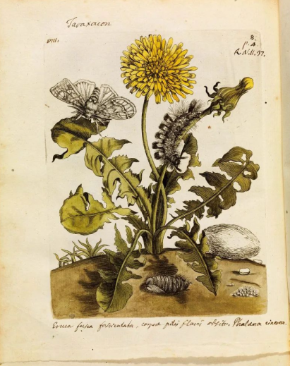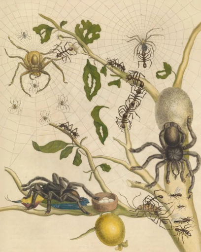 梅里安并不仅仅满足于描绘生物的形态,她更着迷于展现它们的生命循环。她细致地观察着毛毛虫如何蜕变成蝴蝶,蜘蛛如何在蛛网上捕食,蚂蚁如何辛勤地搬运食物……她用画笔记录下这些奇妙的变化,将自然界的生生不息展现得淋漓尽致。