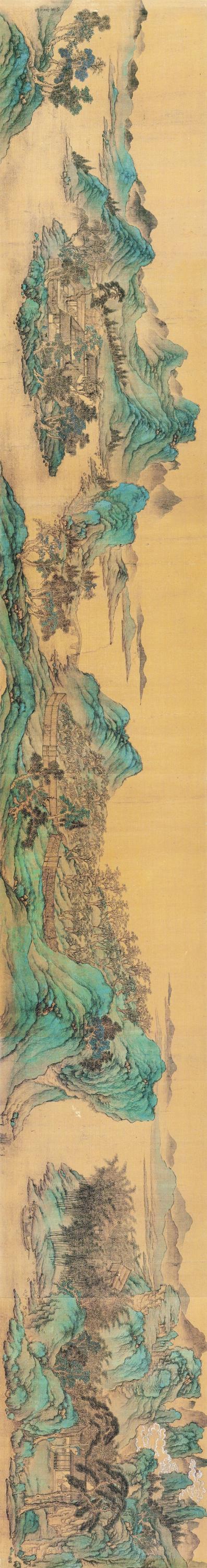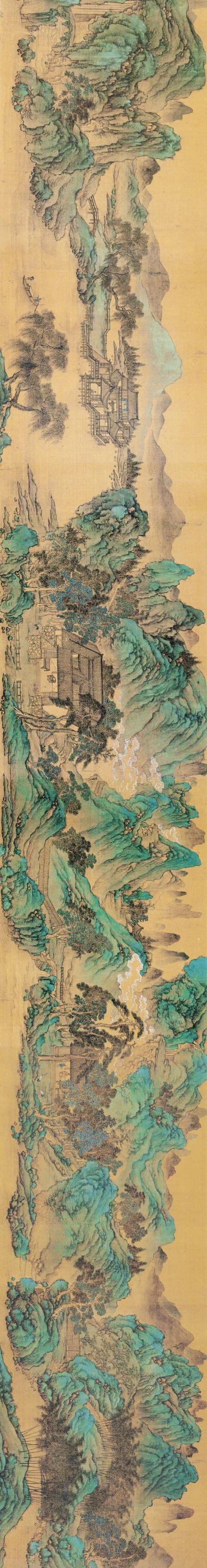 仇英,这位明代的绘画大师,他不是简单地临摹自然,而是将自己的情感融入其中,创造出一个既有唐诗意境,又有明代风情的理想世界。这幅长卷,纵28厘米,横428厘米,缓缓展开,便如同一卷徐徐展开的山水画卷,引领我们步入其中。
