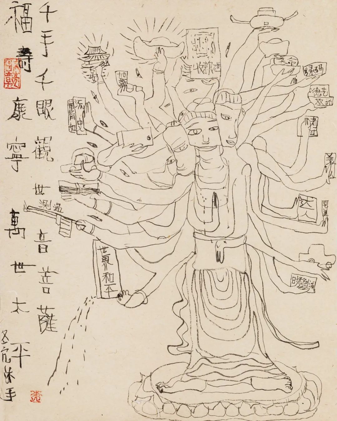 “千手千眼”这幅作品,以水墨的浓淡干湿,展现出一种奇异的张力。仿佛无数只手伸向天空,祈求着雨露的降临,又像无数只眼睛凝视着大地,期盼着生命的复苏。画面中没有具体的人物形象,却充满了人文关怀,让人感受到一种深沉的生命力量。
