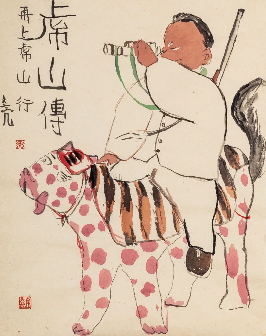 “虎山行”则以设色山水,描绘出一片苍茫雄浑的景象。老虎是力量和勇气的象征,它行走在山间,仿佛守护着这片土地的安宁。画面的色彩浓重而富有层次,将山川的雄伟和老虎的威严展现得淋漓尽致。