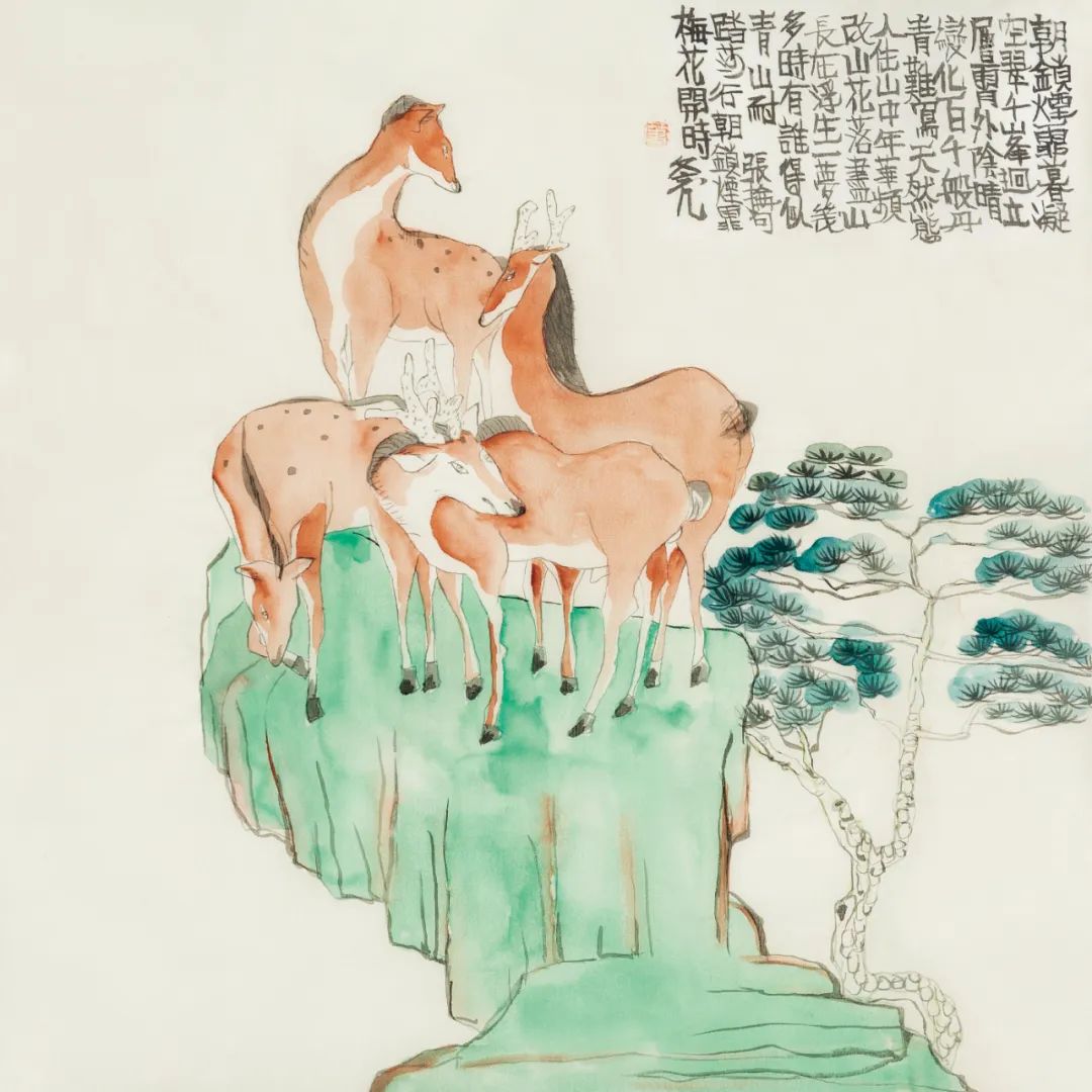 “信物”、“天仙御鹿”、“仙鹿”等作品,则流露出一种淡淡的诗意和浪漫。鹿,在中国文化中象征着祥瑞和美好,它们在画面中悠然自得,仿佛置身于世外桃源。这些作品的色彩清丽淡雅,与水墨的晕染相得益彰,营造出一种梦幻般的意境。